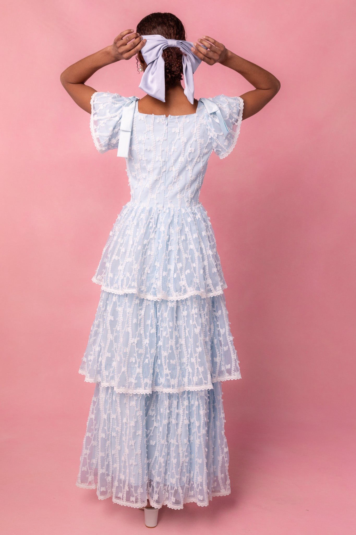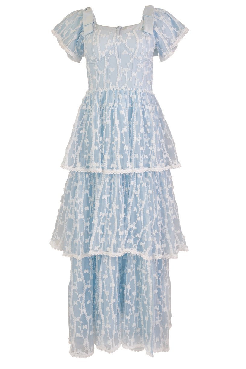 The Annabelle Dress is a stunning piece that is perfect for any special occasion. The baby blue base color is accented with a detailed tulle overlay. featuring white ruffle detailing and embossed bows for a delicate and feminine touch. The sweetheart neckline and padded breast cups with corset boning create a flattering silhouette. while the triple tiered skirt adds elegant movement. With a hidden back zipper and full lining. this maxi length dress is both comfortable and beautiful.