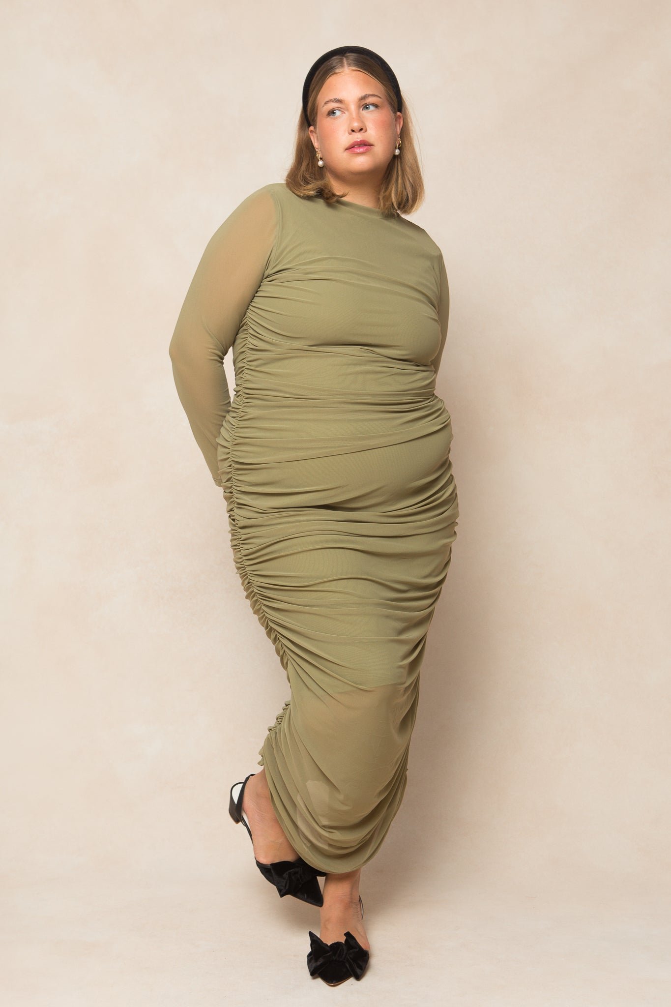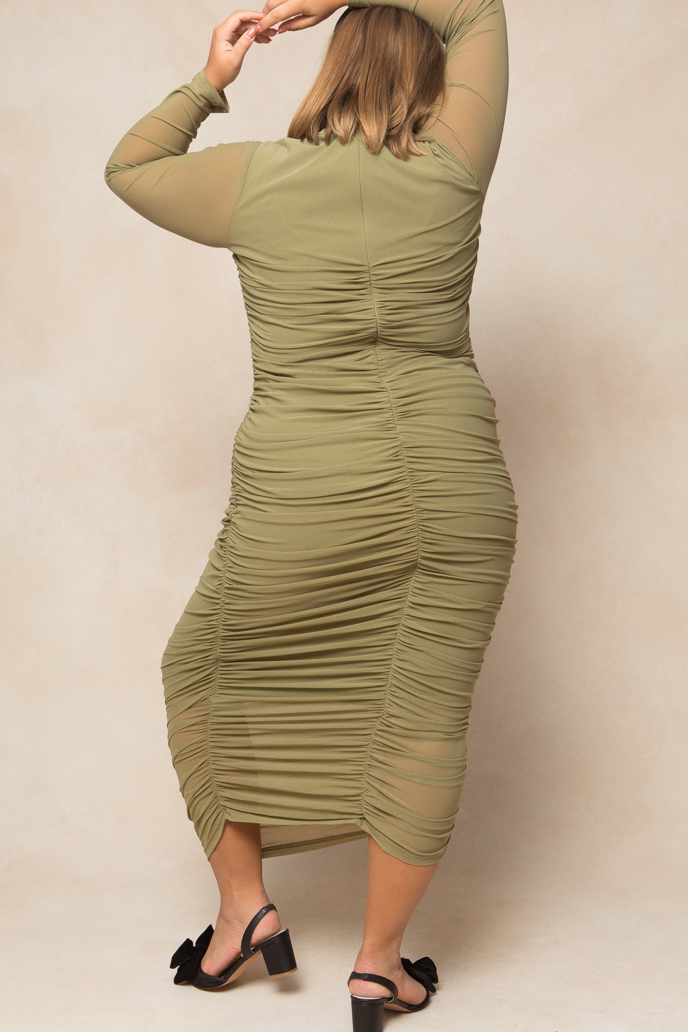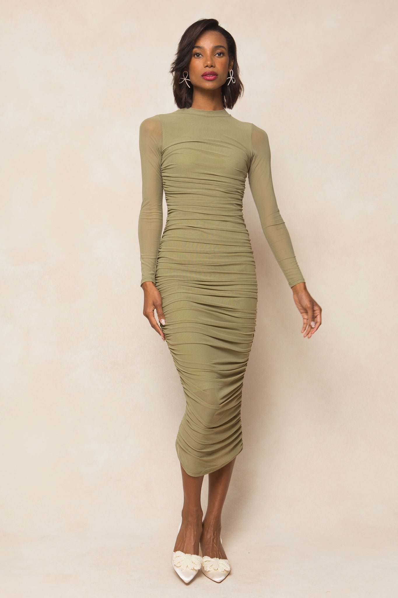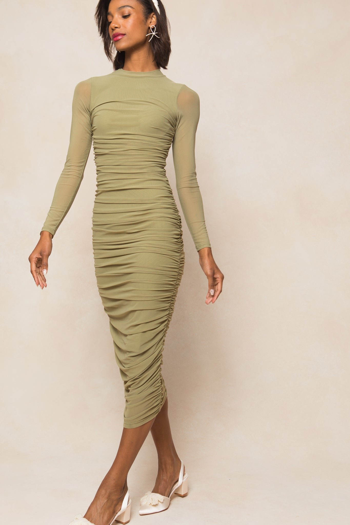 Get ready to turn heads in our stunning Brynn Dress! Made from soft chiffon fabric. this mock neck women’s dress features long fitted sleeves and a flattering midi-length skirt with ruched detailing throughout. The hidden back zipper ensures a sleek fit. while the bodice and skirt lining provide comfort and support. Maternity friendly + perfect for any and every occasion!