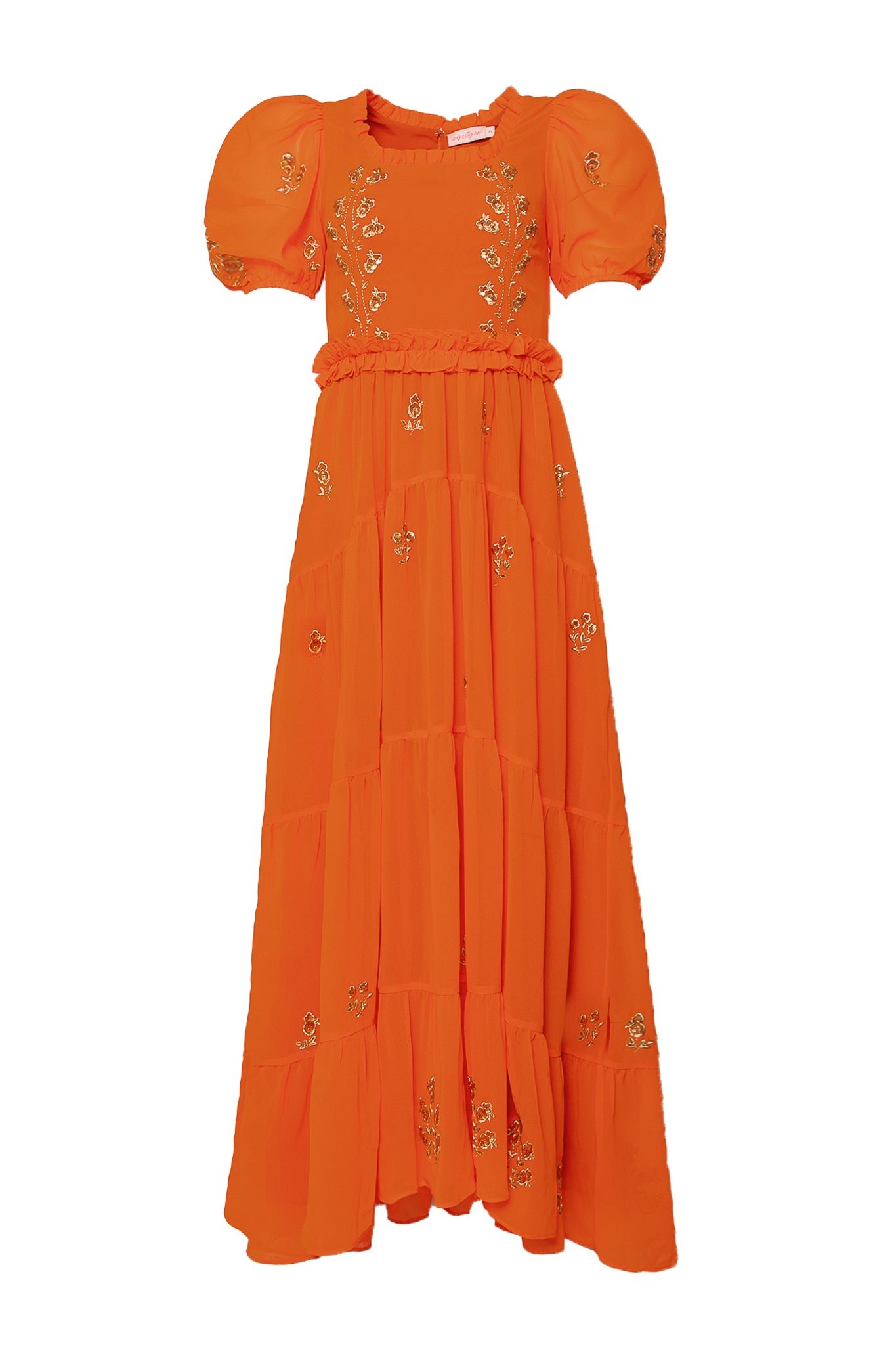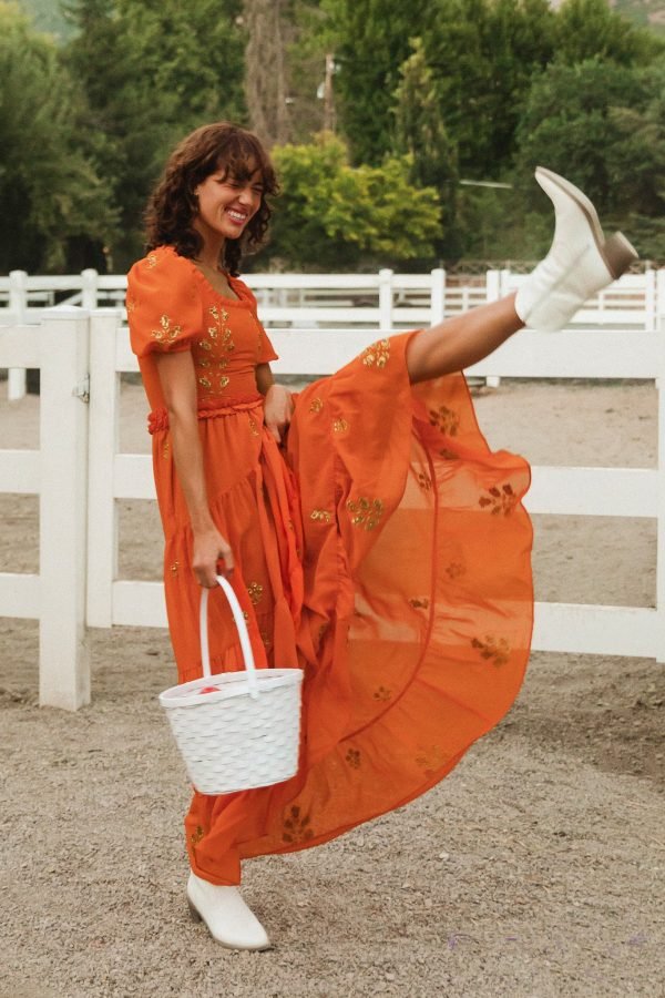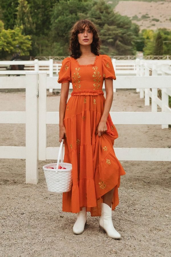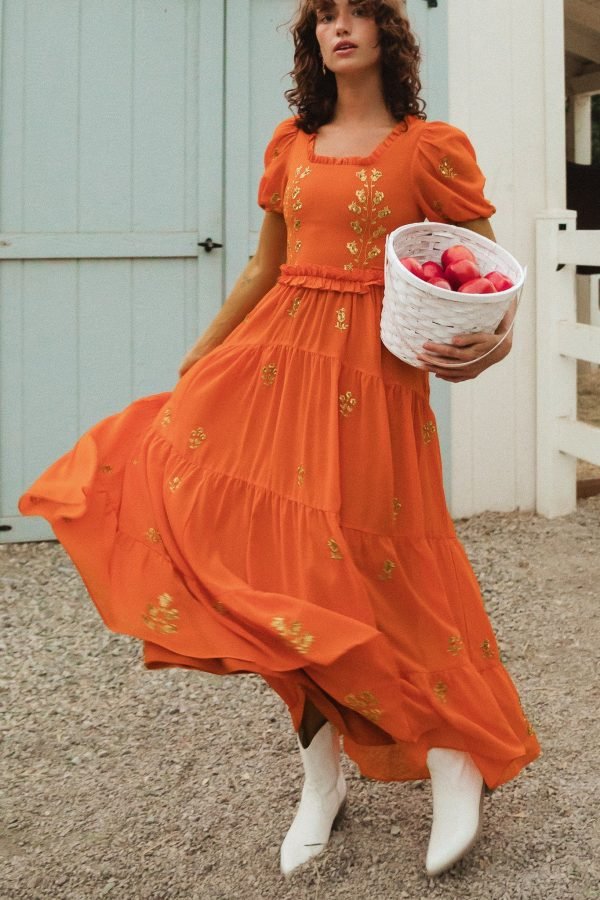 Introducing our Folklore Dress. a whimsical Taylor Swift inspired addition to your fall wardrobe. Crafted with orange chiffon and gold embroidery. this women’s maxi dress features a square neckline with ruffle detailing and short puff sleeves. The tiered skirt adds movement. while hidden pockets provide convenience. Perfect for any occasion.