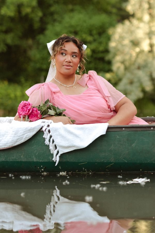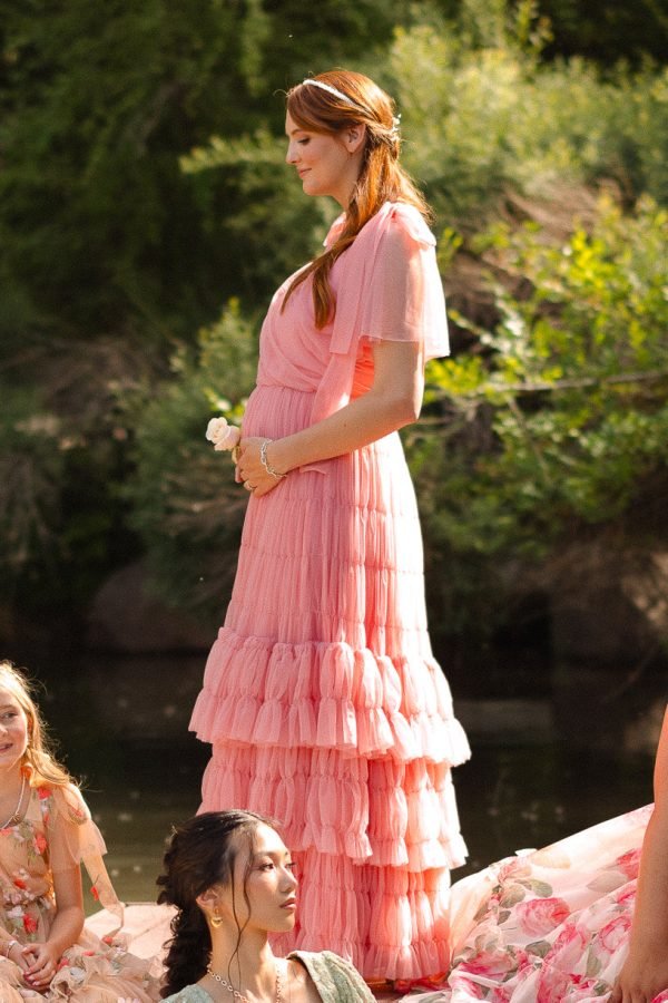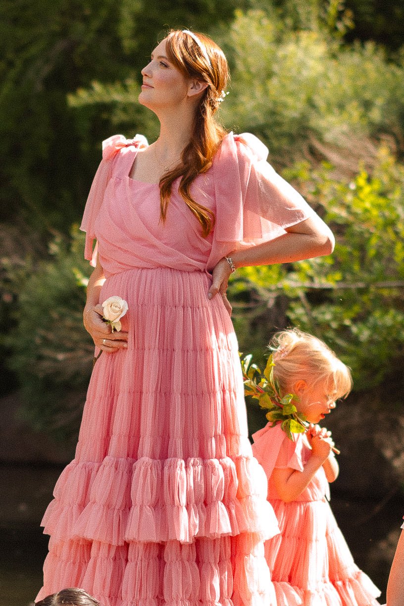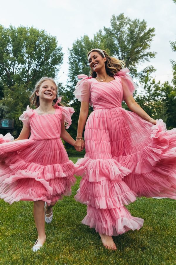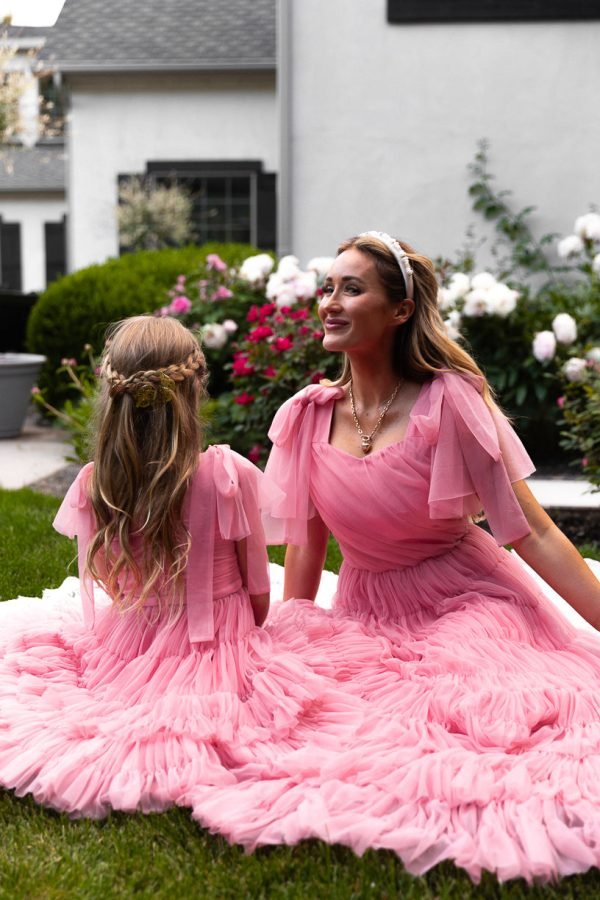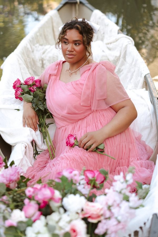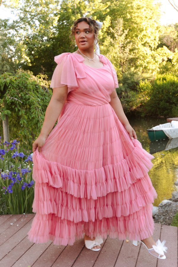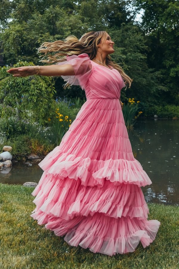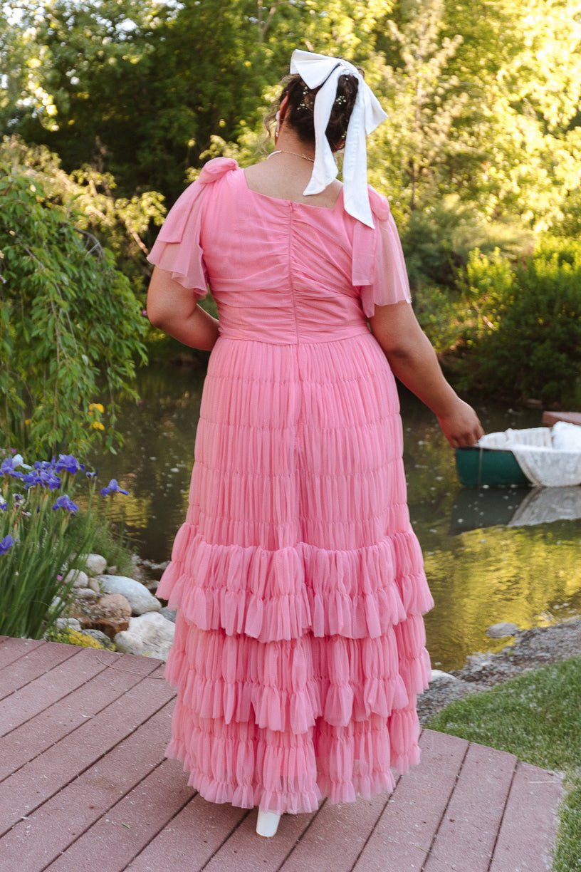 The Hermione Dress is made of pink chiffon fabric and features a sweetheart neckline. a maxi length ruffle tiered skirt. and can we talk about the cute bows on the flutter sleeves?! This dress also features a hidden back zipper and lined bodice and skirt. Perfect for a elegant look!