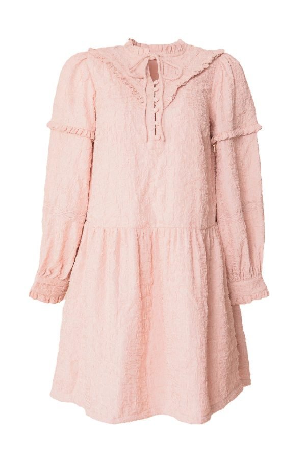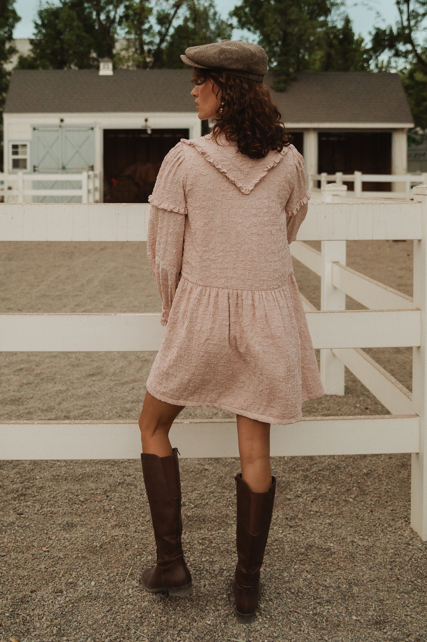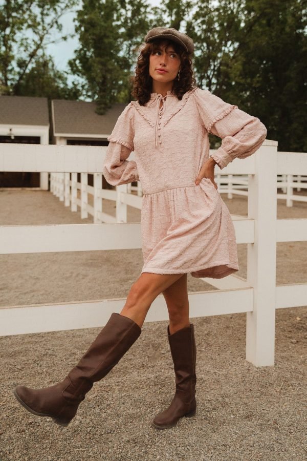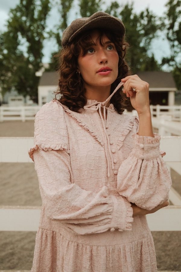 The Jace Dress is the perfect combination of comfort and style. Made from a soft. tan woven fabric with delicate lace detailing throughout. this knee-length women’s dress features a high ruffled neckline with a functional bow and long flowy sleeves. The lace and ruffle detailing add a touch of femininity. while the fully lined design allows for easy transition from day to night. Maternity friendly and easy to slip on. this all-in-one outfit is a must-have for any fashion lover.