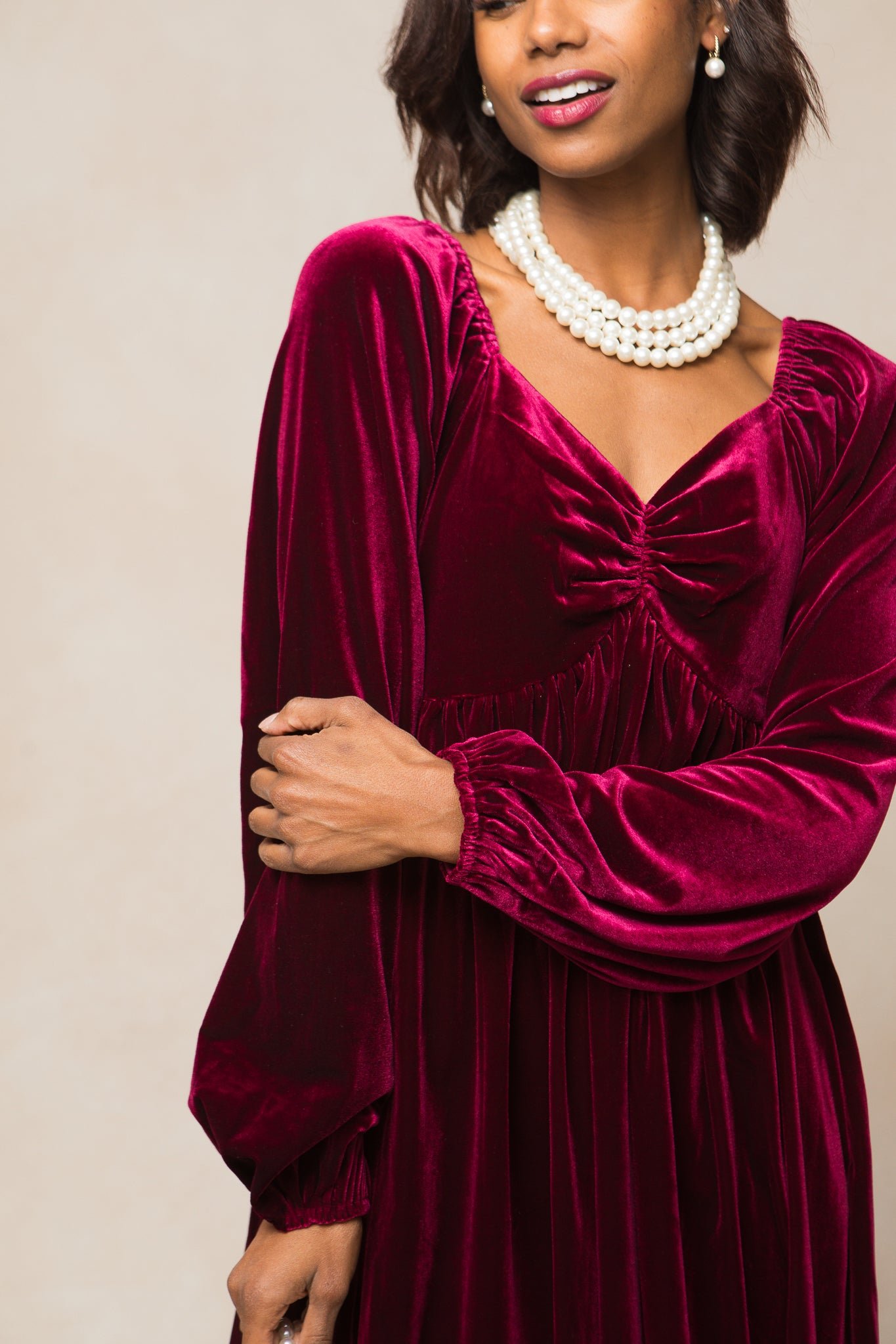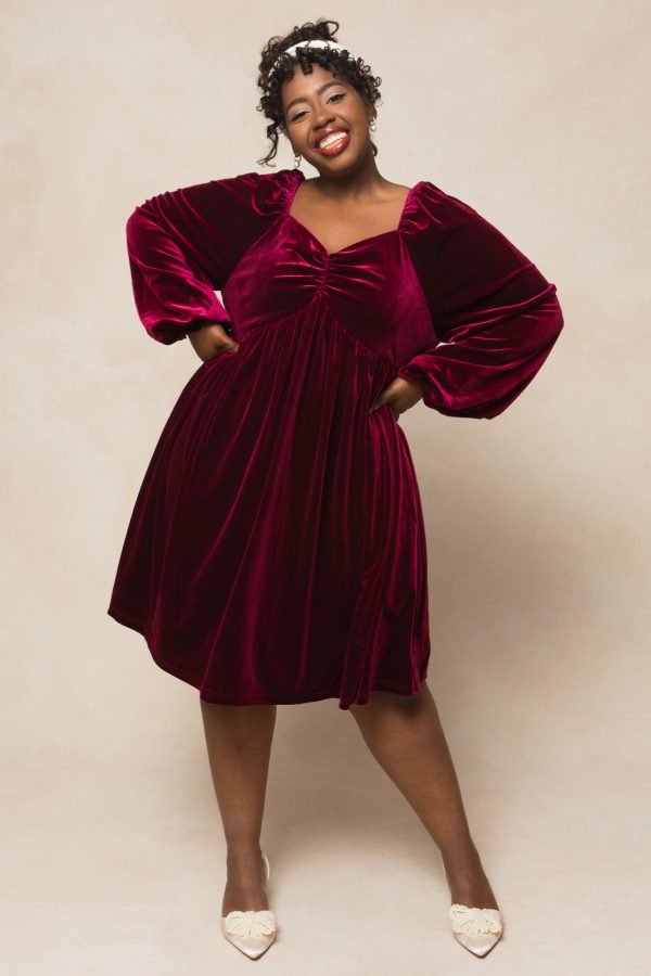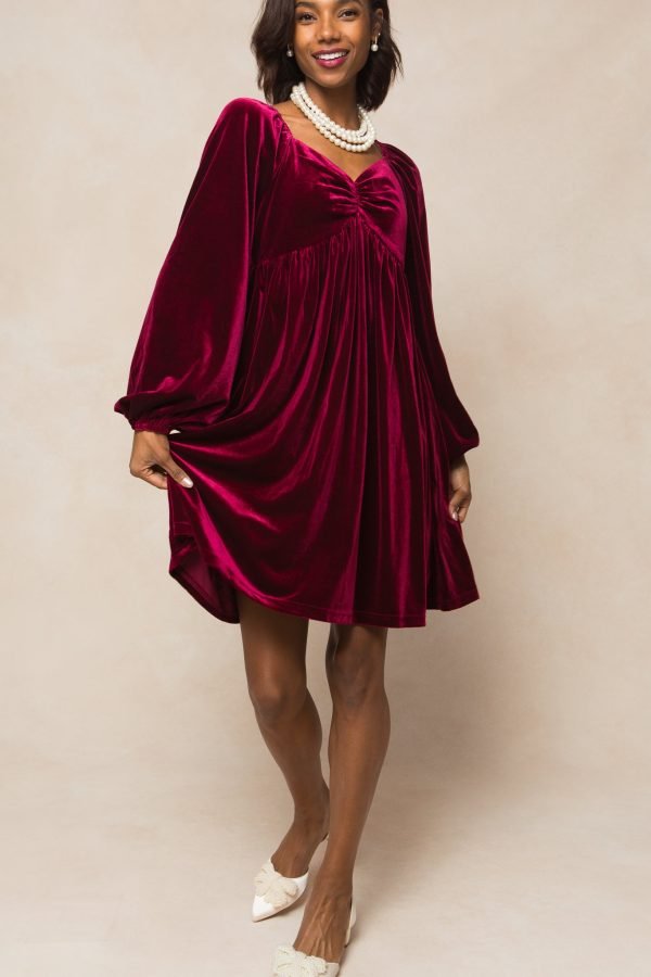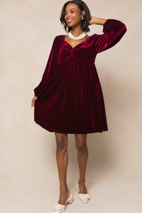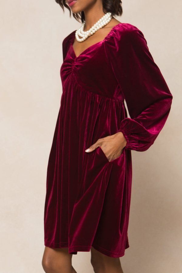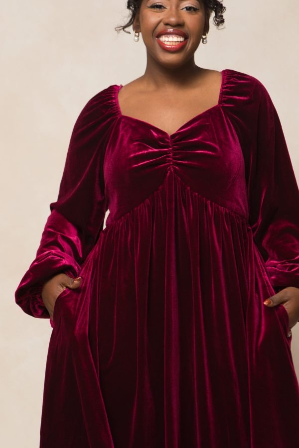 Add some “ooh la la” to your wardrobe with the Jewel Dress in Wine! The rich wine velvet fabric and sweetheart neckline with ruched detailing on the bodice make this dress a showstopper. With long balloon sleeves and a midi-length skirt with pockets. this women’s dress is both chic and functional. The hidden back zipper and full lining add extra comfort. Plus. it’s maternity-friendly!