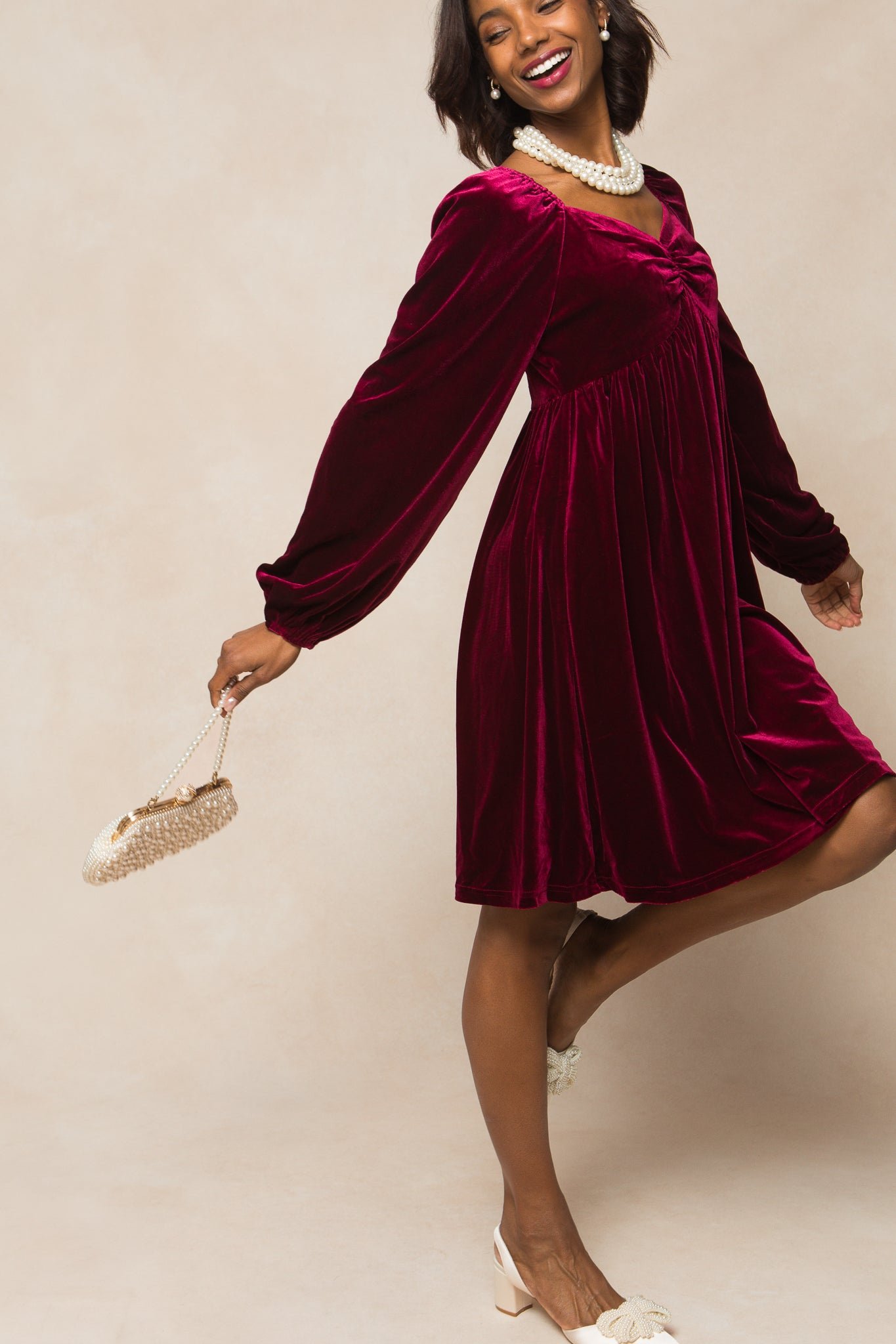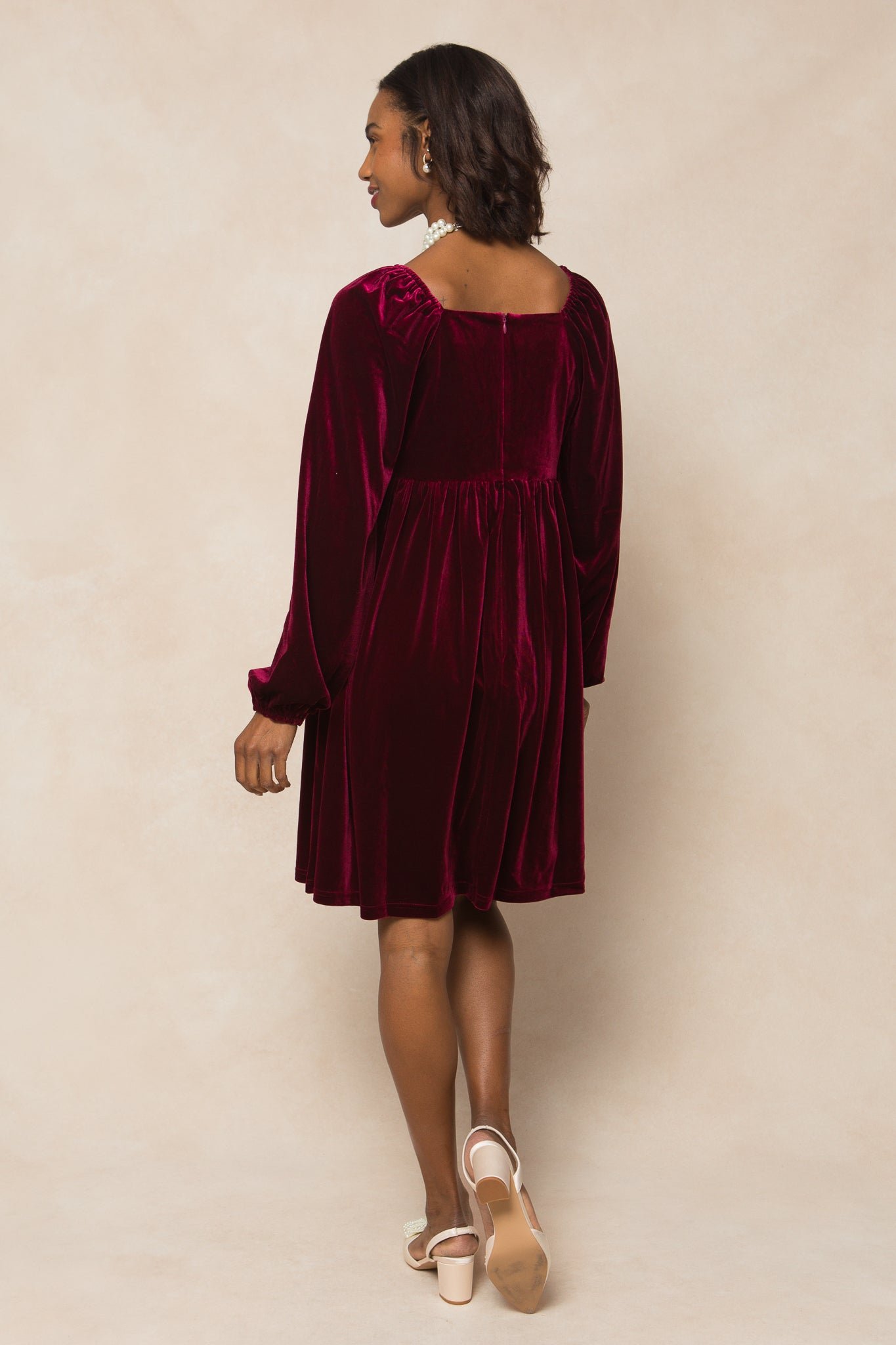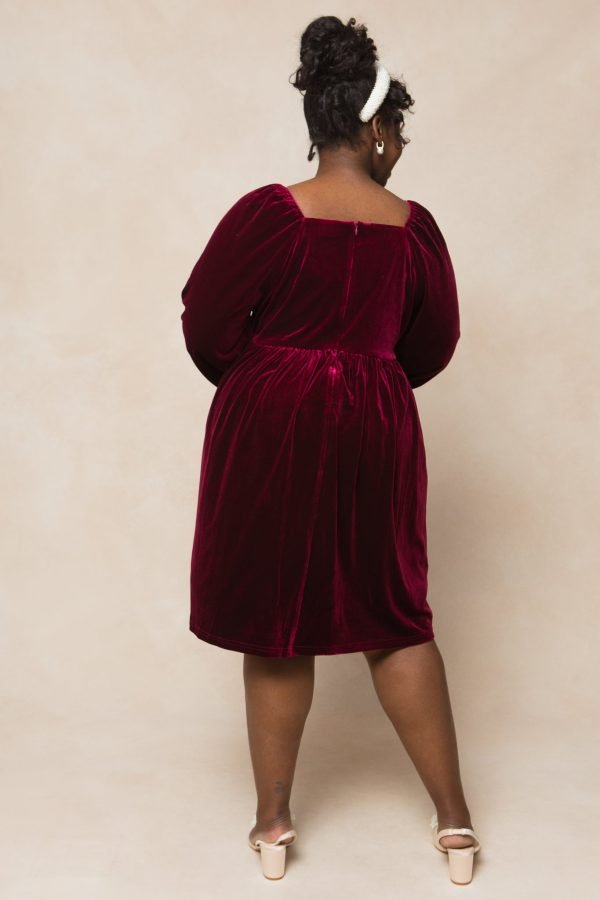 Add some “ooh la la” to your wardrobe with the Jewel Dress in Wine! The rich wine velvet fabric and sweetheart neckline with ruched detailing on the bodice make this dress a showstopper. With long balloon sleeves and a midi-length skirt with pockets. this women’s dress is both chic and functional. The hidden back zipper and full lining add extra comfort. Plus. it’s maternity-friendly!