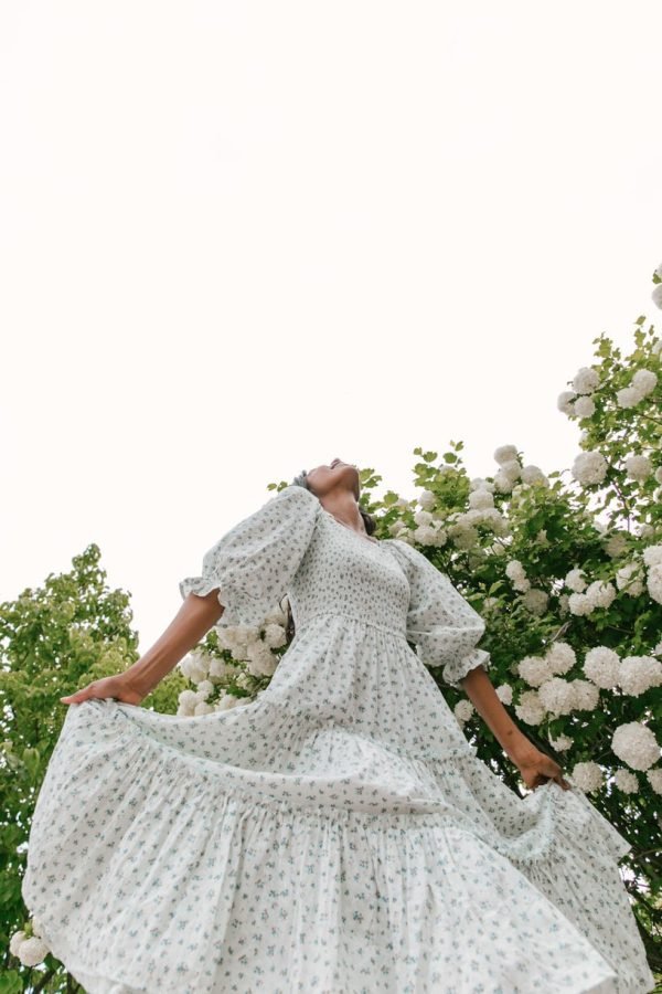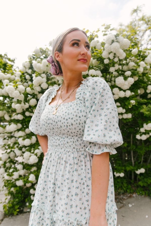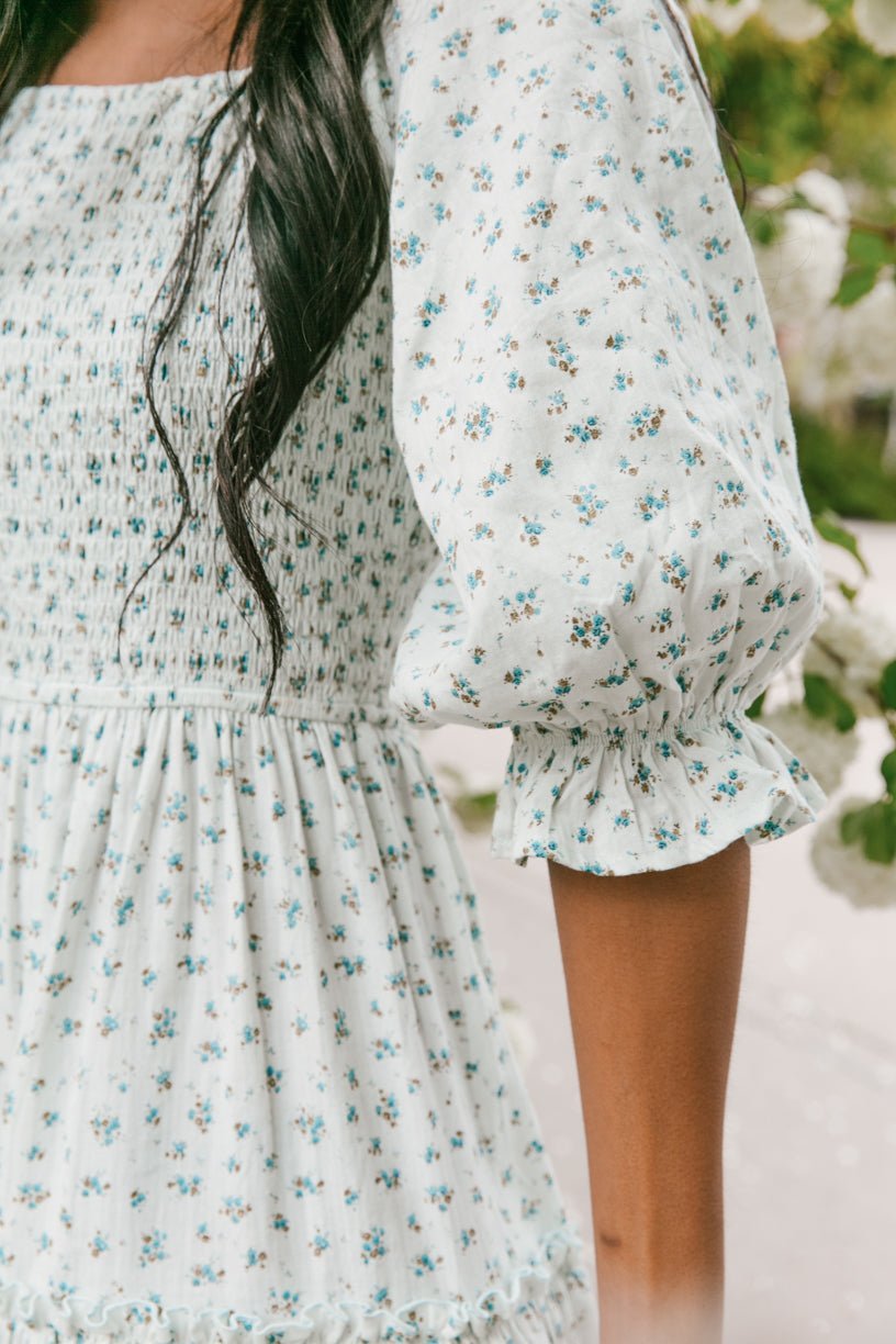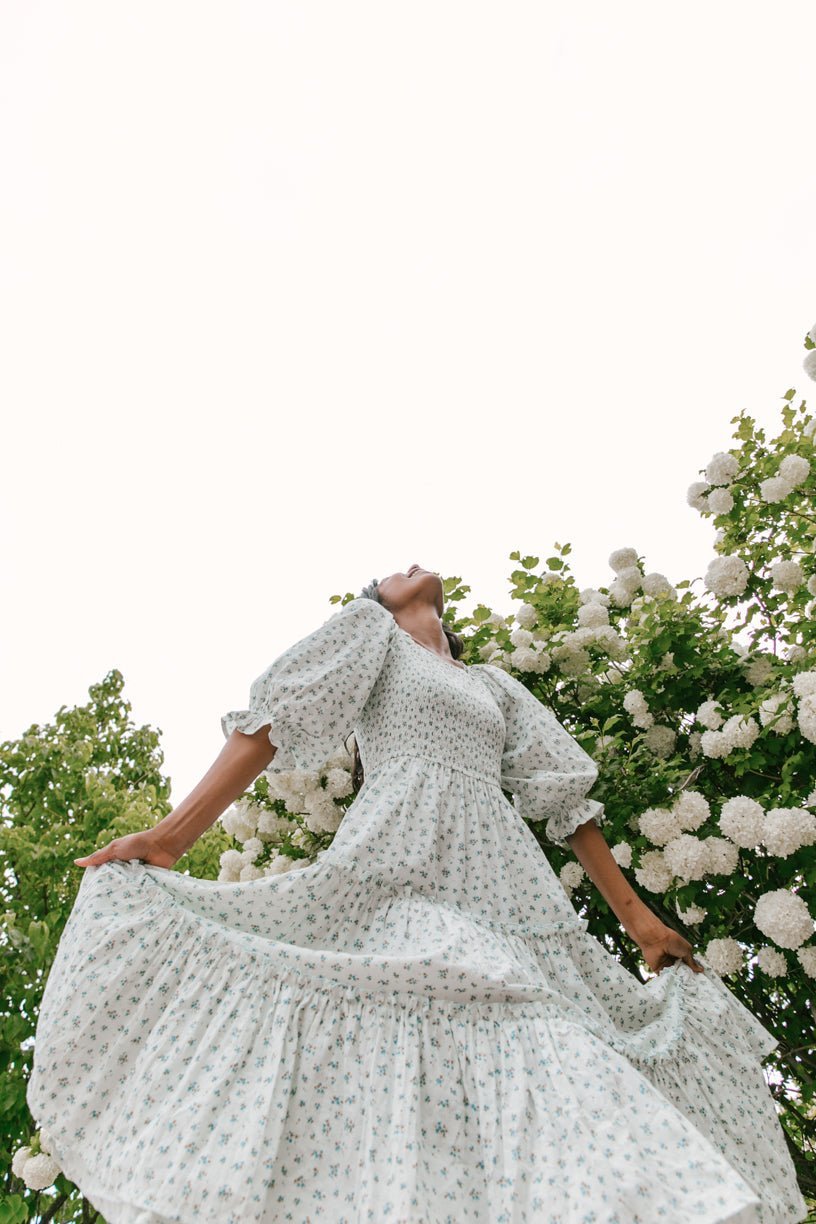 Flowy. feminine. and functional. Everything this carefree tea-length dress is made of. Inspired by enchanting beauty. the wind in your hair. and the celebration of being grounded to mother earth. Smocked bodice with puff sleeves and ruffle details. Dreamy muted blues and greens and a micro floral print.