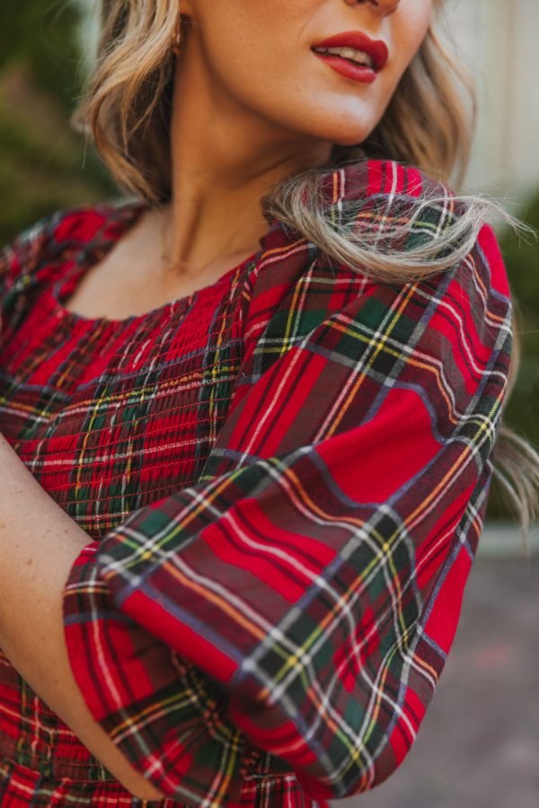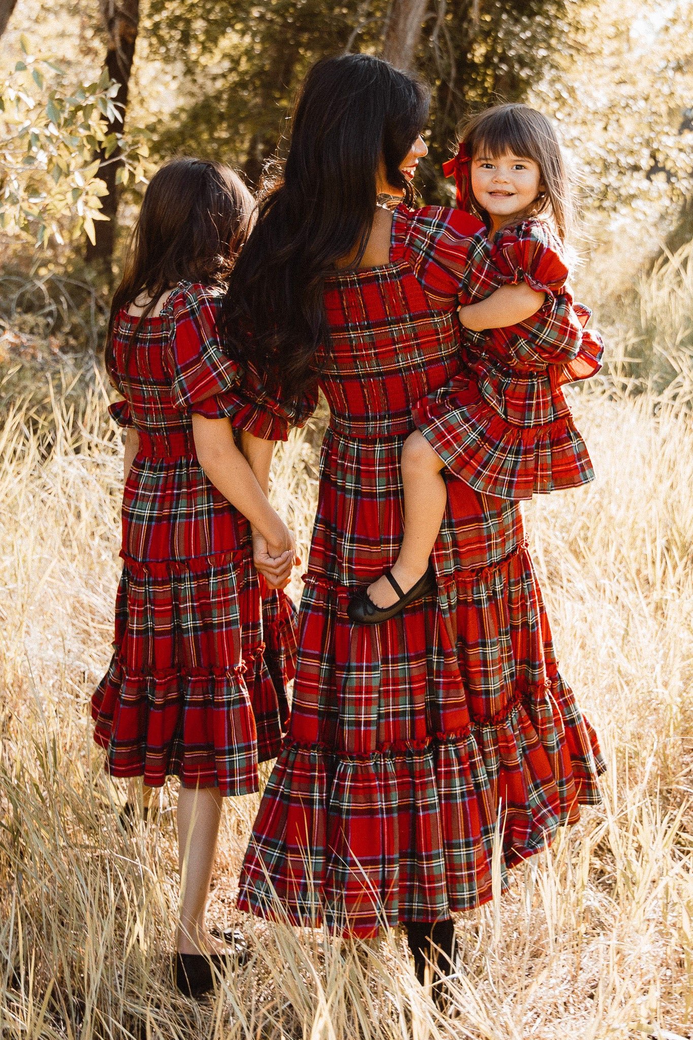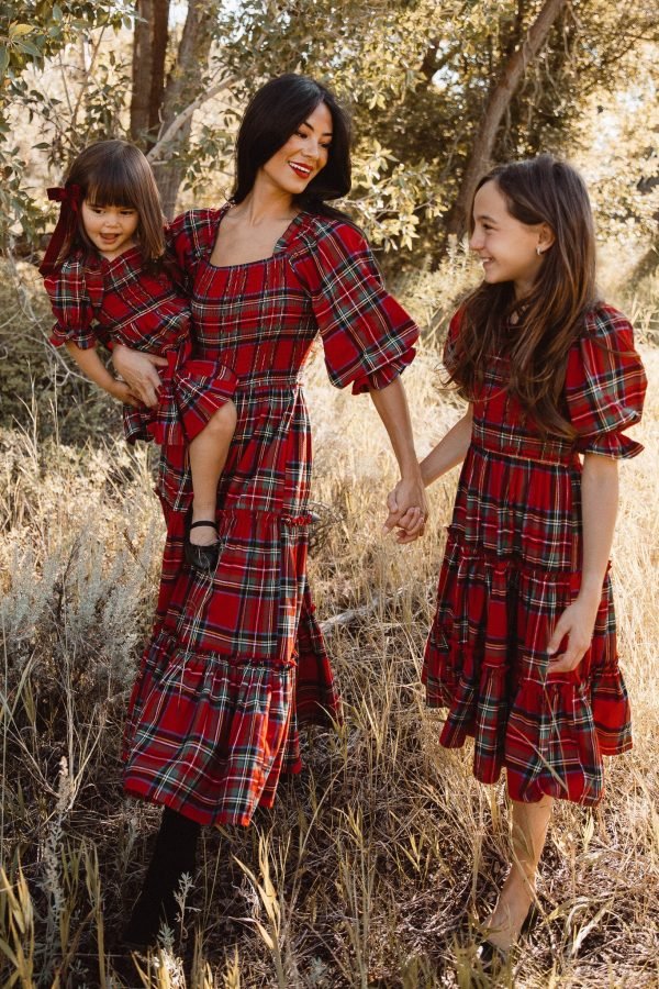 SHE’S BACK!! Our all-time favorite Madeline Dress in Holiday Plaid. Featuring our best-selling silhouette and a festive plaid print! Flowy. feminine. and functional. Everything this carefree midi-length women’s dress is made of. Inspired by family time. fireplaces. and cozy evenings with friends. Smocked bodice with puff sleeves and ruffle details finish it off. Available in matching looks for the whole family!