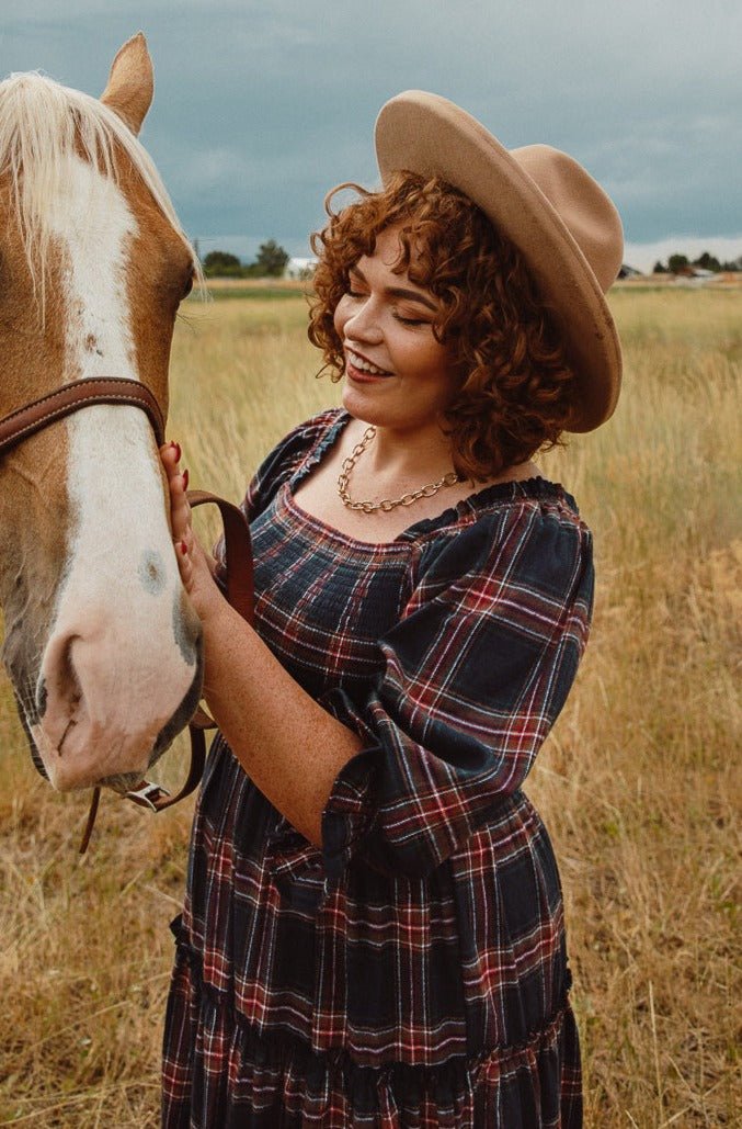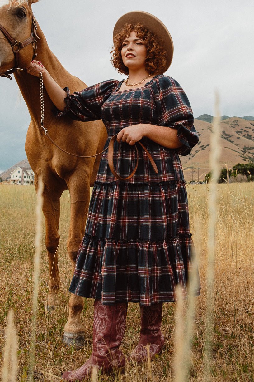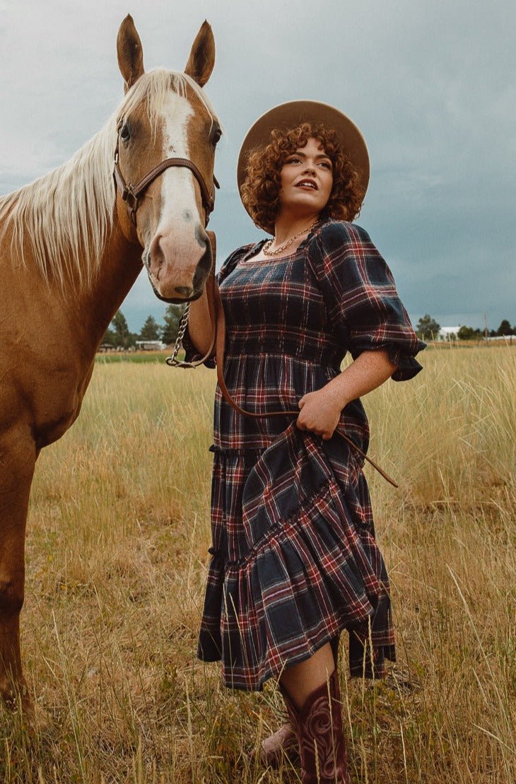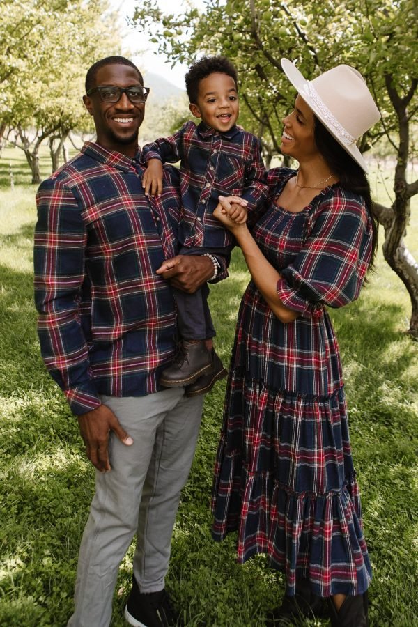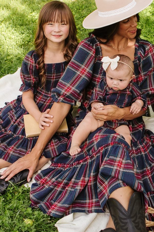 A tried and true Ivy City favorite – The Madeline Dress is BACK in a gorgeous navy plaid! Flowy. feminine. and functional. This festive midi-length dress features a smocked bodice. puff sleeves and ruffle details. And let’s not forget this style is both maternity friendly and nursing friendly! Perfect for family matching. family photo season. fall weddings and more!