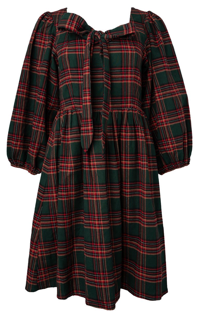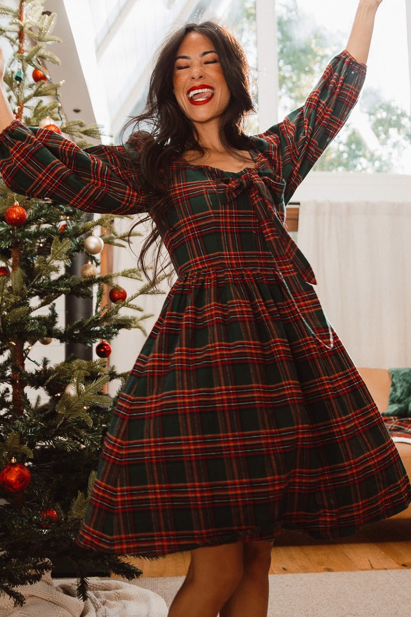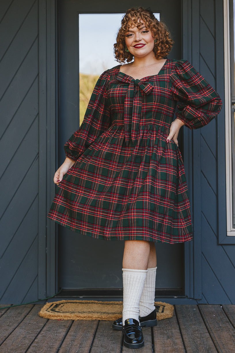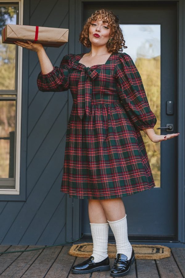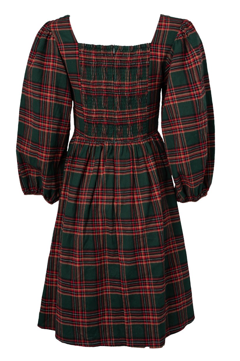 The Margo Short Dress is our knee length version of this timeless holiday style. Constructed from a classic red and green plaid print. this dress features a smocked panel in the back and a large beautiful bow in front. Finished with a hidden back zipper and long sleeves. you will look and feelfestiveall season long.