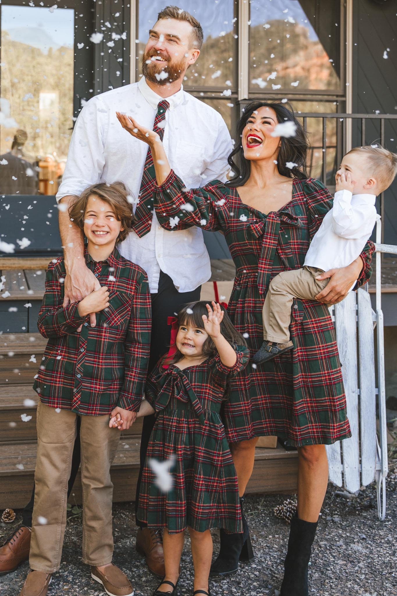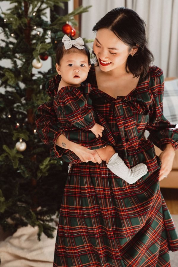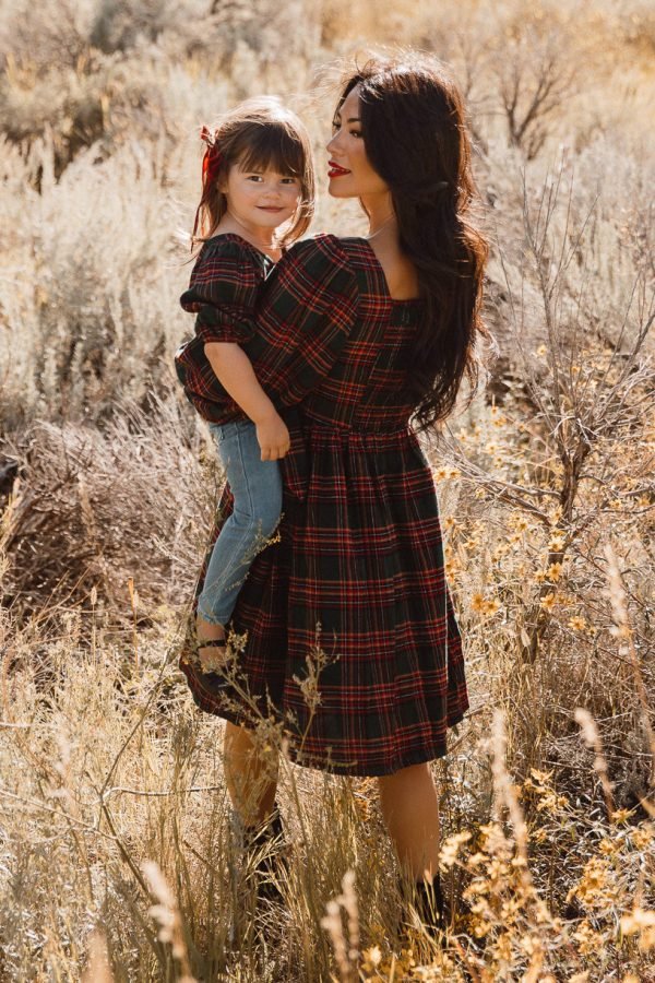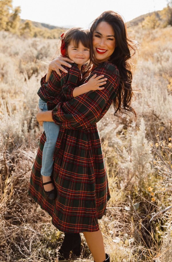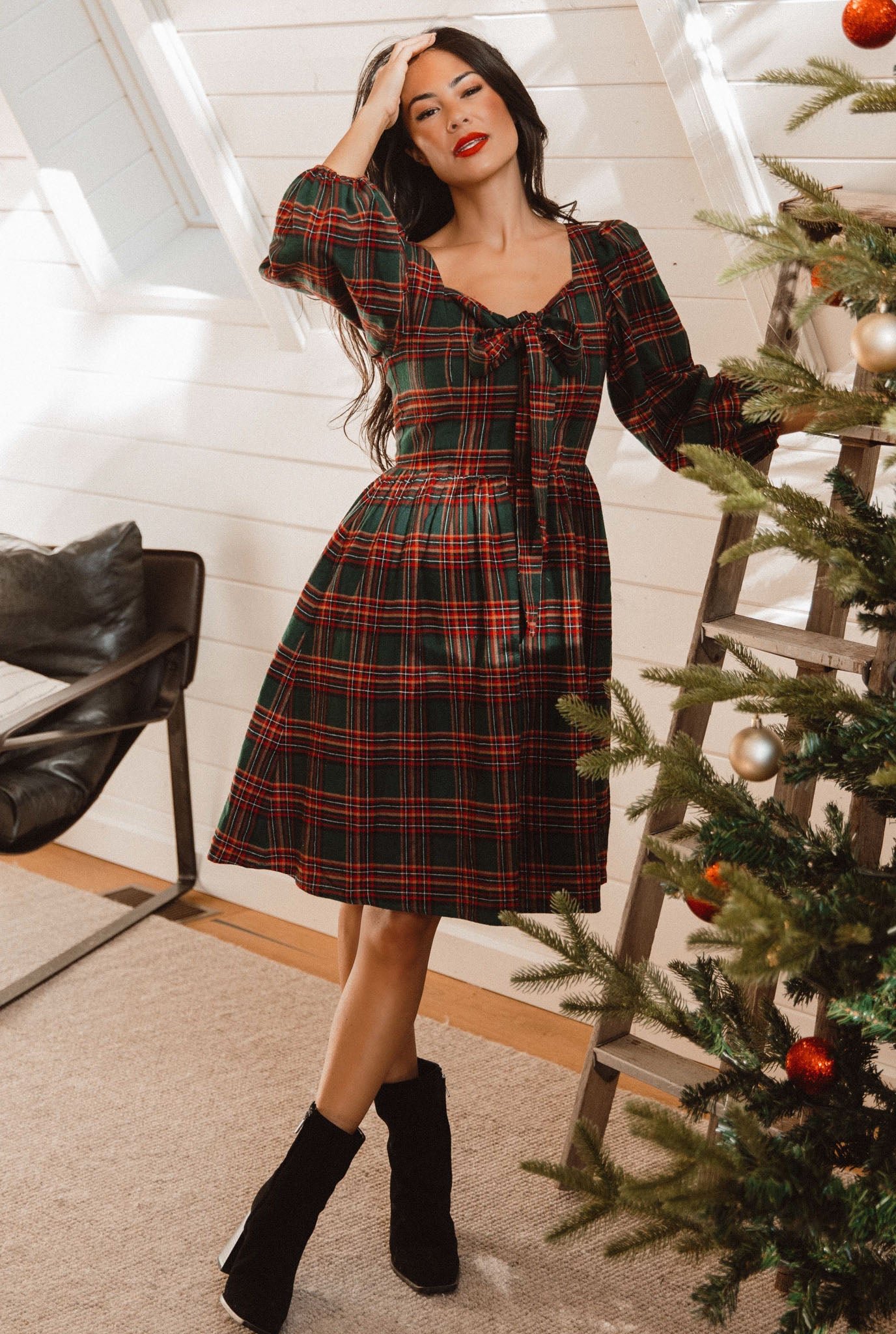 The Margo Short Dress is our knee length version of this timeless holiday style. Constructed from a classic red and green plaid print. this dress features a smocked panel in the back and a large beautiful bow in front. Finished with a hidden back zipper and long sleeves. you will look and feelfestiveall season long.