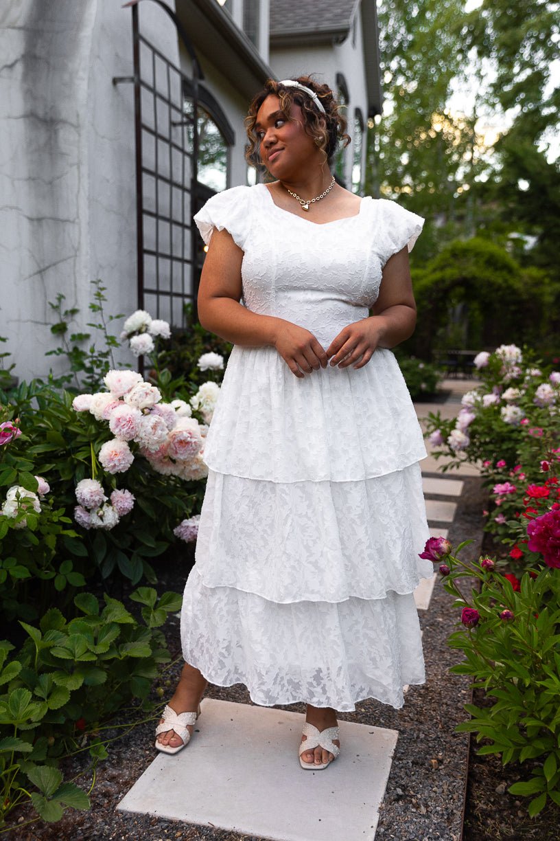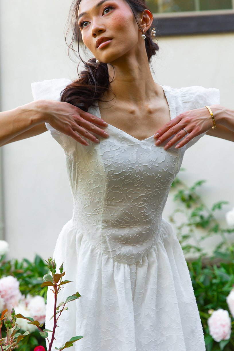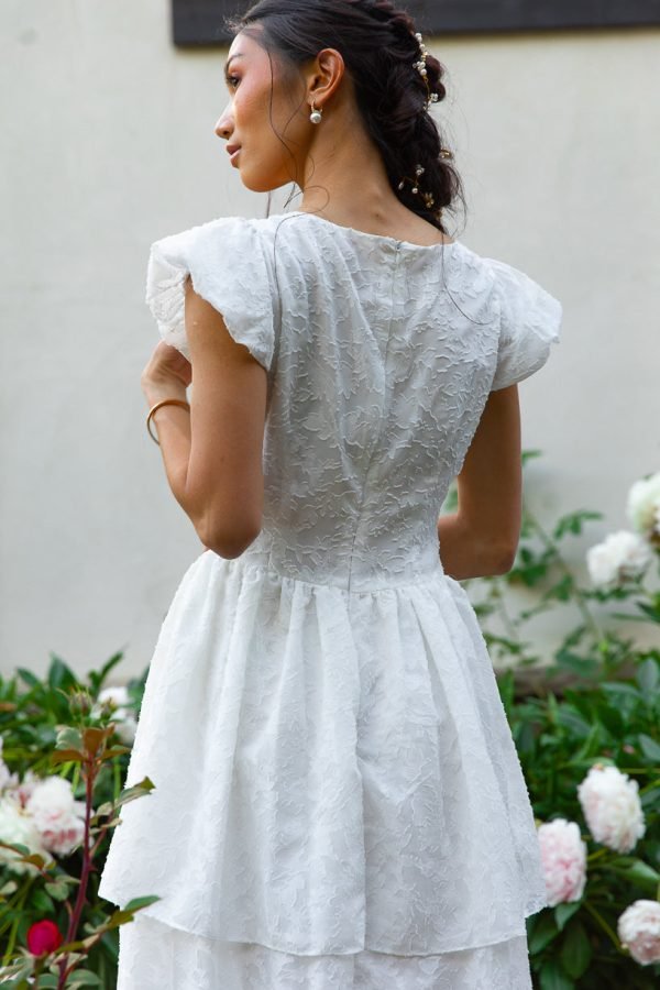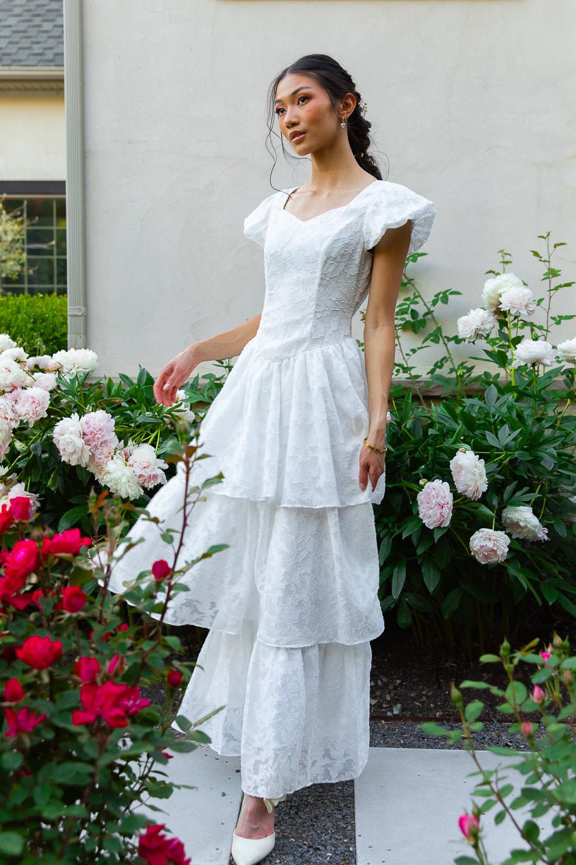 Get ready to turn heads in the Mimi Dress! Made from a delicate white botanical textured chiffon fabric. this dress features a flattering sweetheart neckline and cute cap puff sleeves. Some of our favorite details are the maxi length tiered skirt. the hidden back zipper. and basque waist to ensure a perfect and flattering fit.