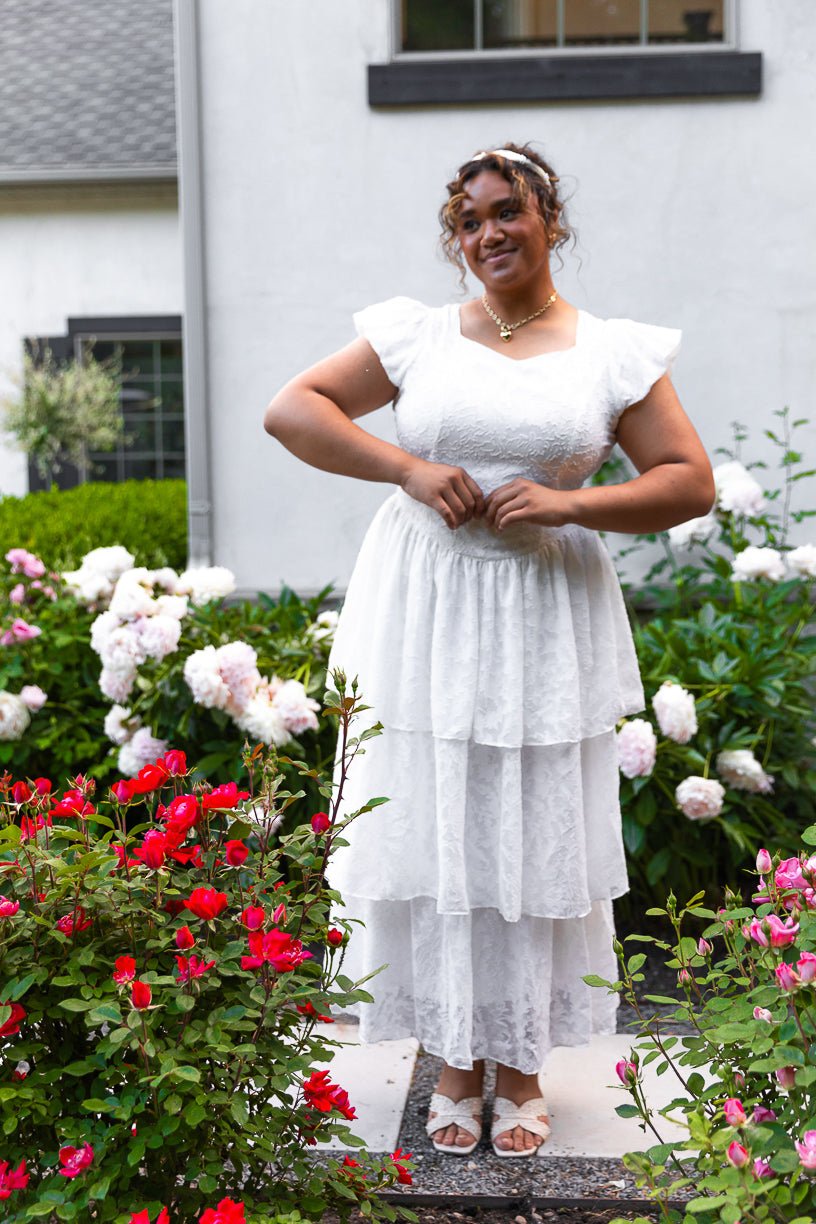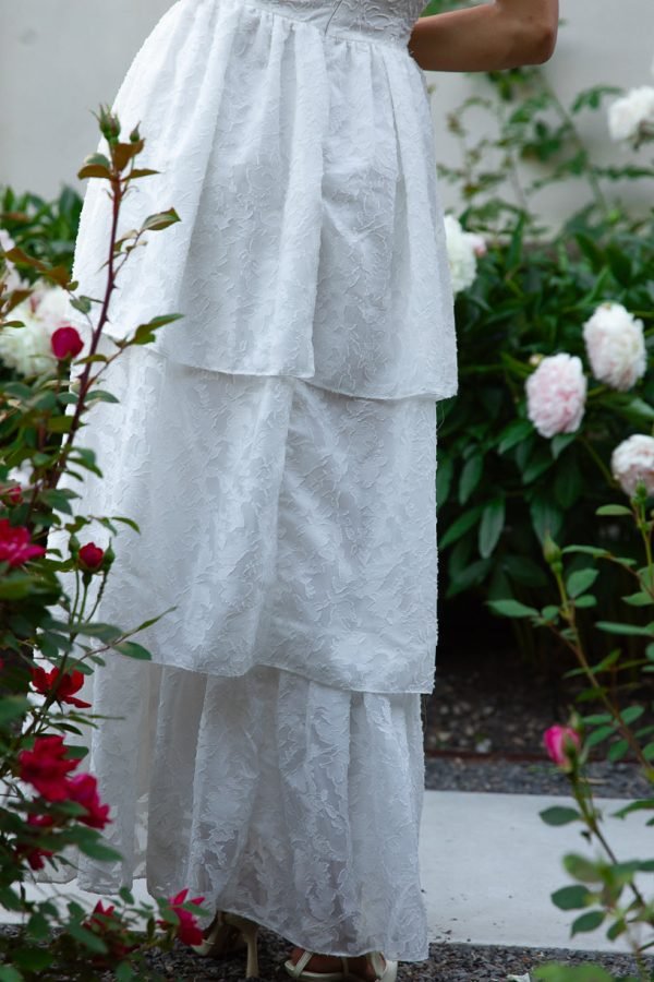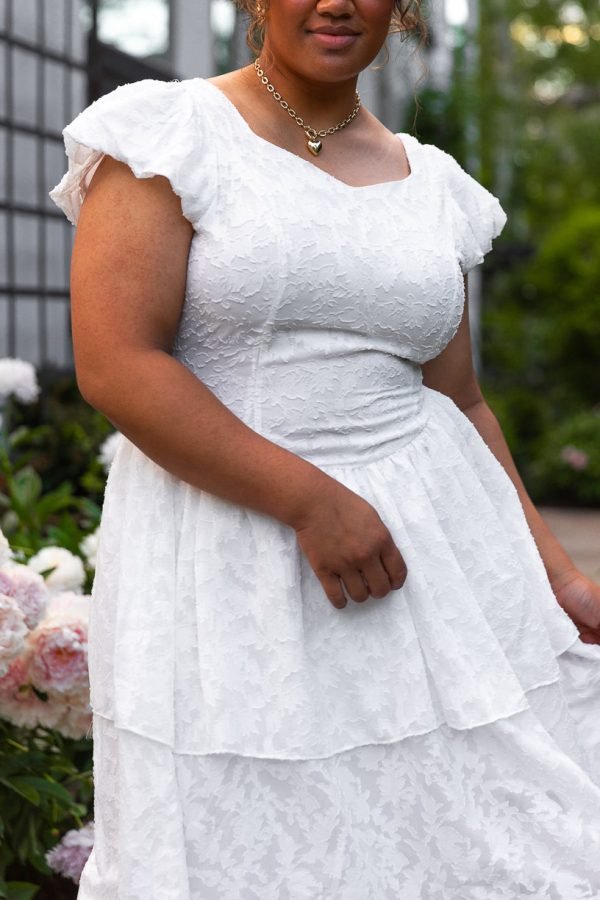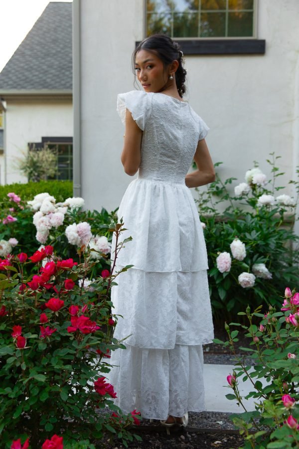 Get ready to turn heads in the Mimi Dress! Made from a delicate white botanical textured chiffon fabric. this dress features a flattering sweetheart neckline and cute cap puff sleeves. Some of our favorite details are the maxi length tiered skirt. the hidden back zipper. and basque waist to ensure a perfect and flattering fit.