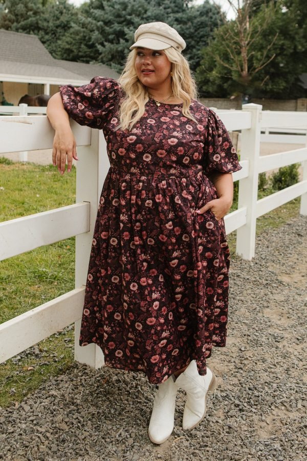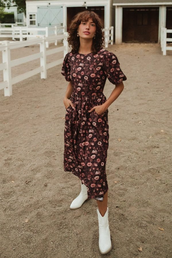 Introducing the Odette Dress. a flirty and functional piece for any occasion. Featuring a charming neutral floral print on brown woven fabric. it’s elevated by subtle details like a round neckline. puff sleeves. and hidden back zipper. With pockets and a midi-length skirt. this women’s dress is both practical and stylish!