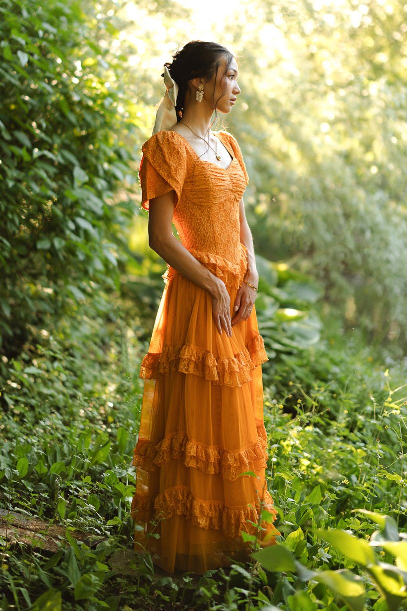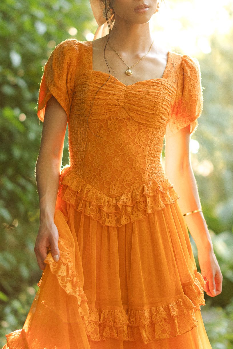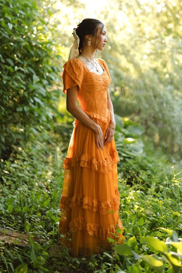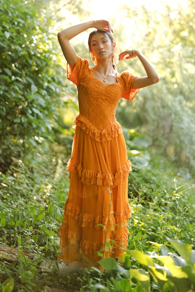 Step into a world of timeless tales and charm with the enchanting Raya dress. Its orange lace fabric and sweetheart neckline exude evermore. while the half length petal sleeves add a touch of whimsy. It features a maxi length skirt with a tiered tulle ruffle overlay.