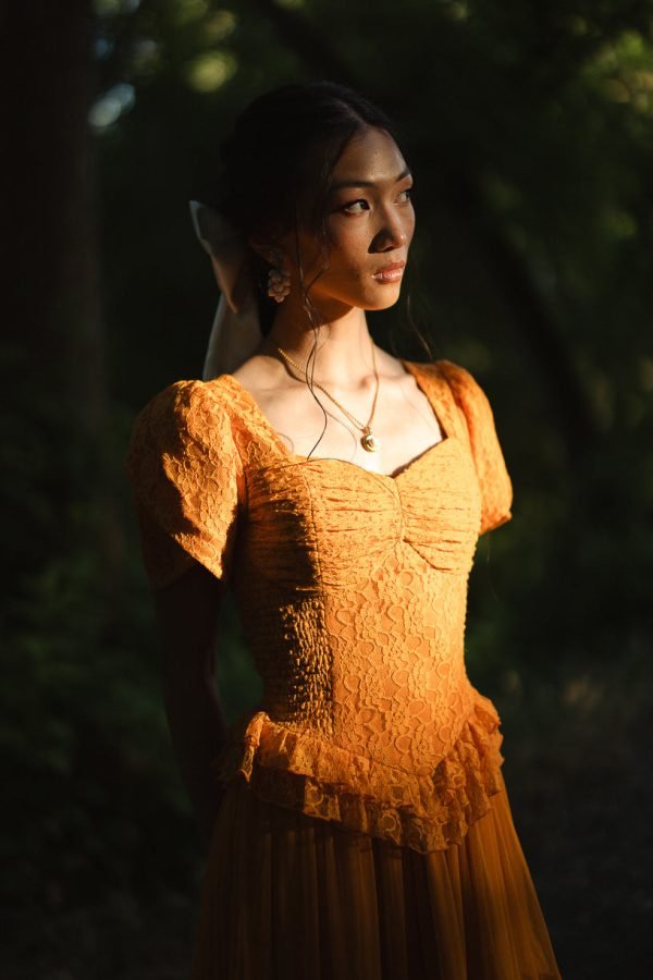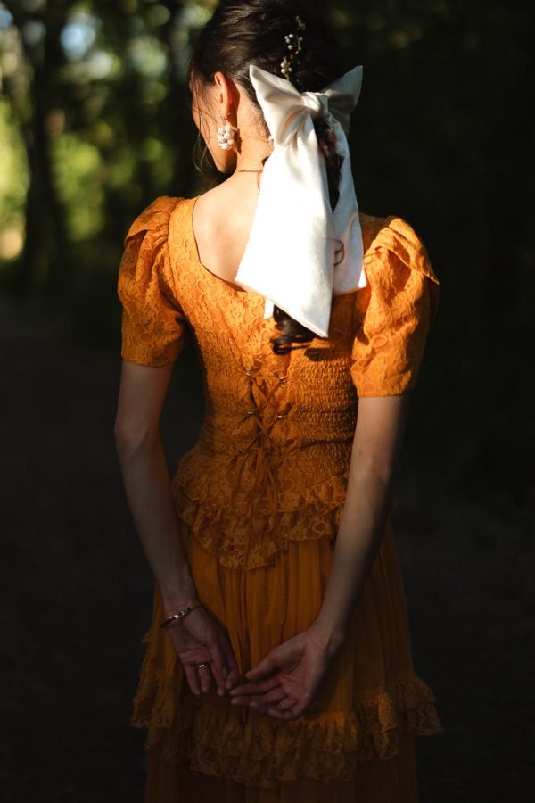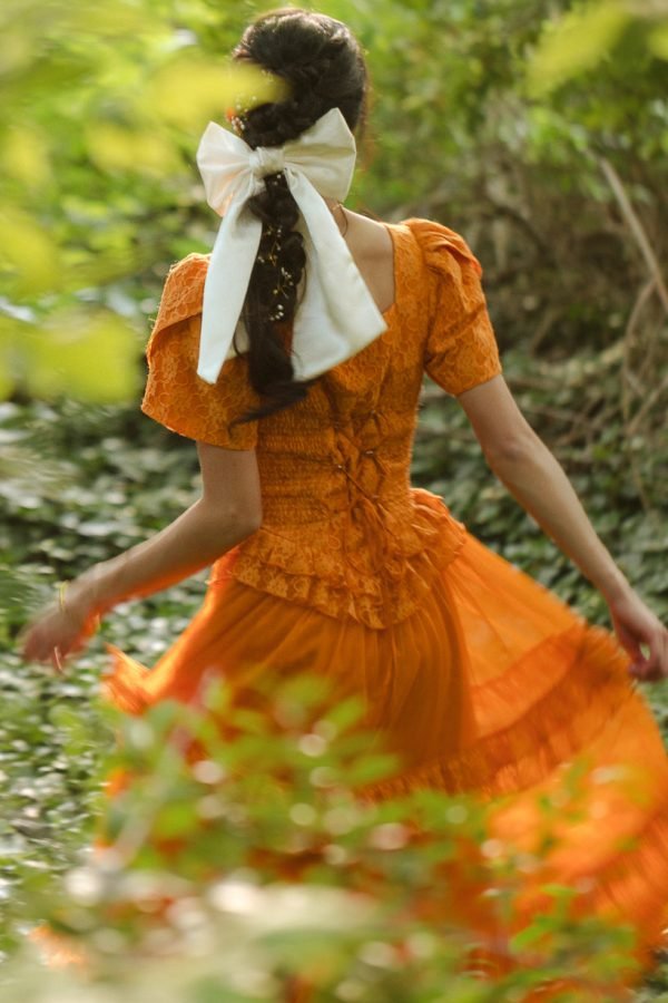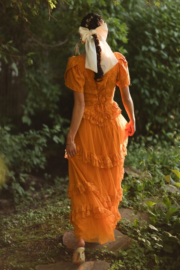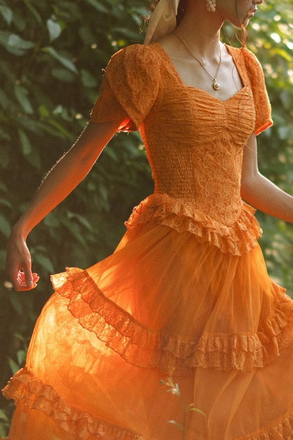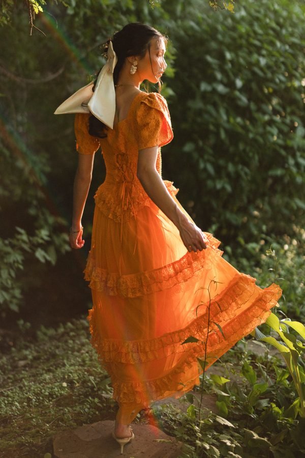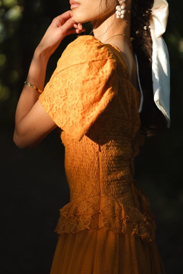 Step into a world of timeless tales and charm with the enchanting Raya dress. Its orange lace fabric and sweetheart neckline exude evermore. while the half length petal sleeves add a touch of whimsy. It features a maxi length skirt with a tiered tulle ruffle overlay.