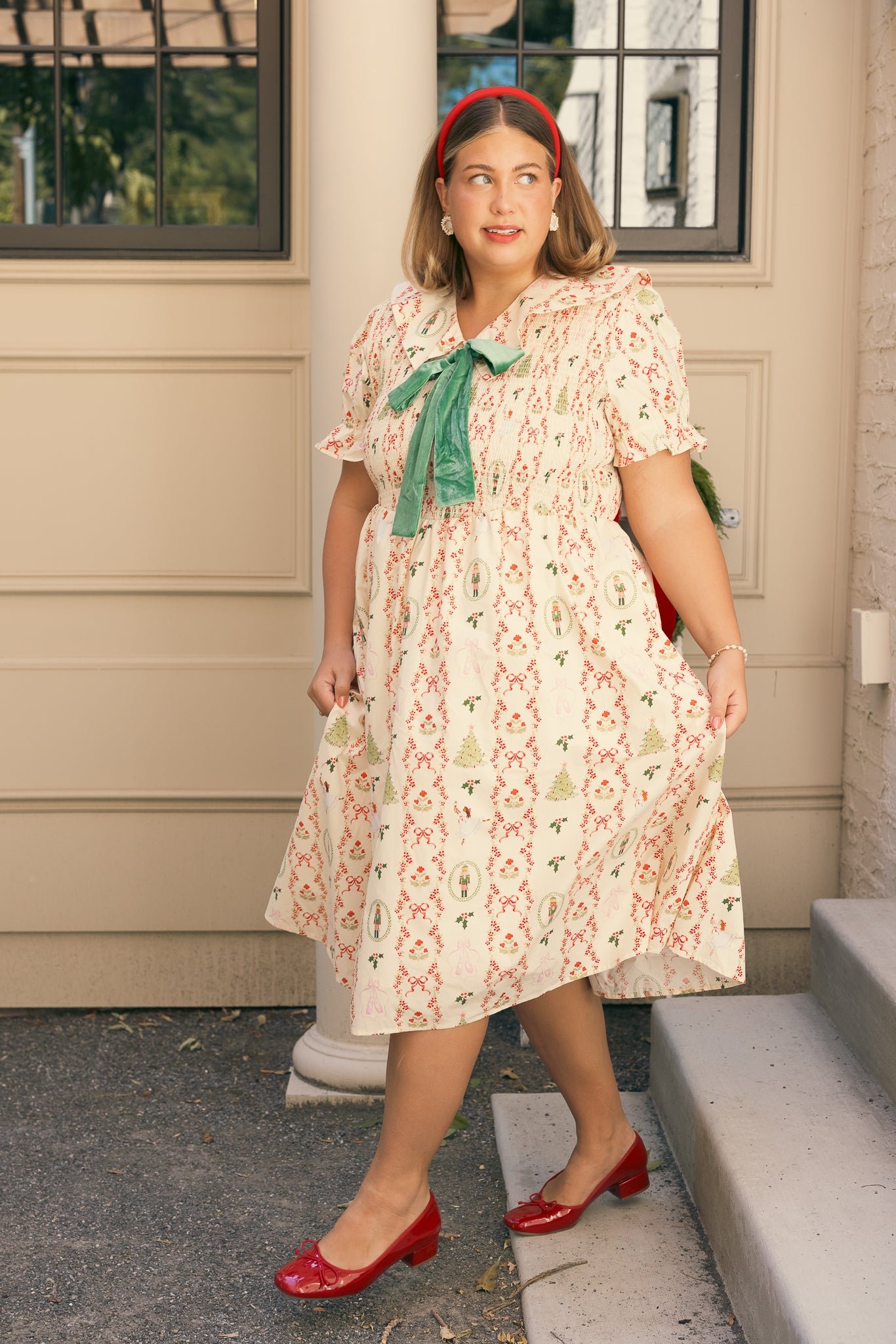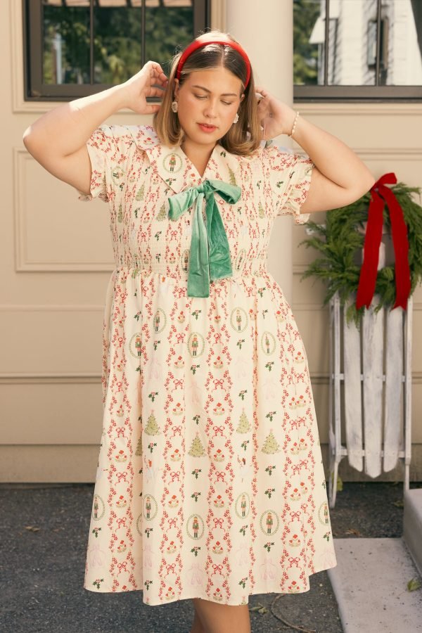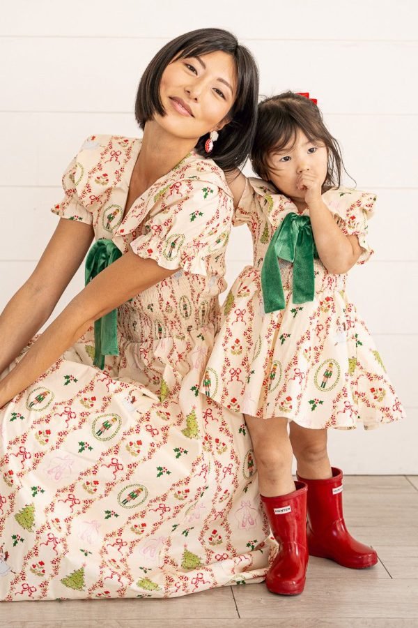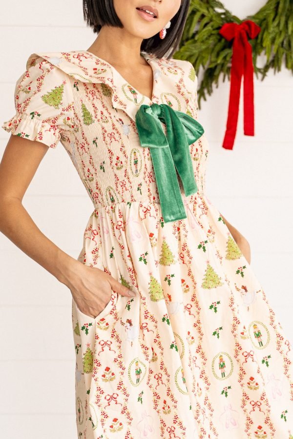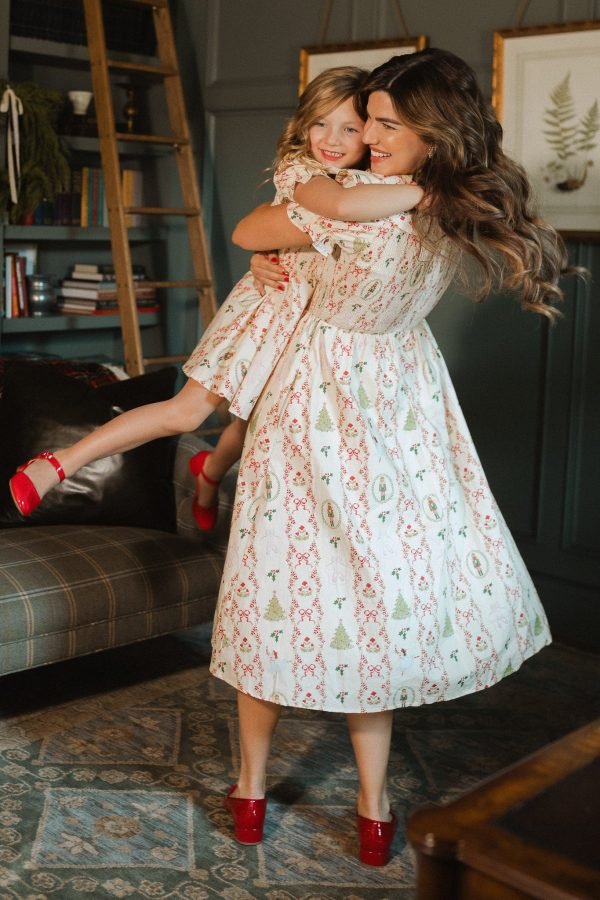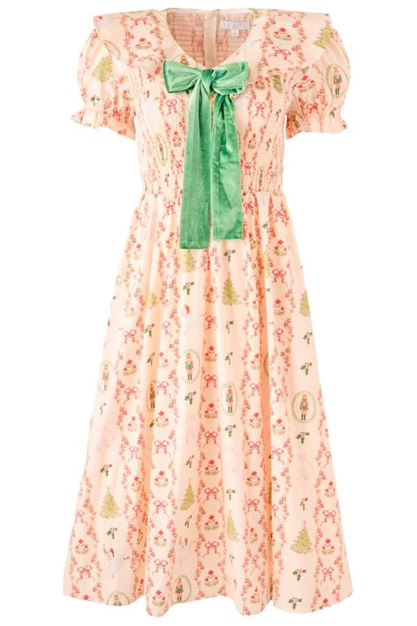 The dress that screams “happy holidays!” Introducing our festive collaboration with artist Celeste Clark! Featuring the most magical Nutcracker inspired print. with hand-drawn bows. Christmas trees. ballet slippers and more! Ruffle detailing. a beautiful velvet bow and smocking add delicate touches of femininity and class. She’s a beautiful holiday piece that you’ll wear for years and years!