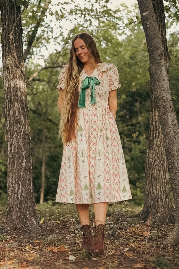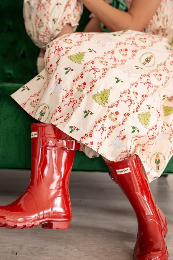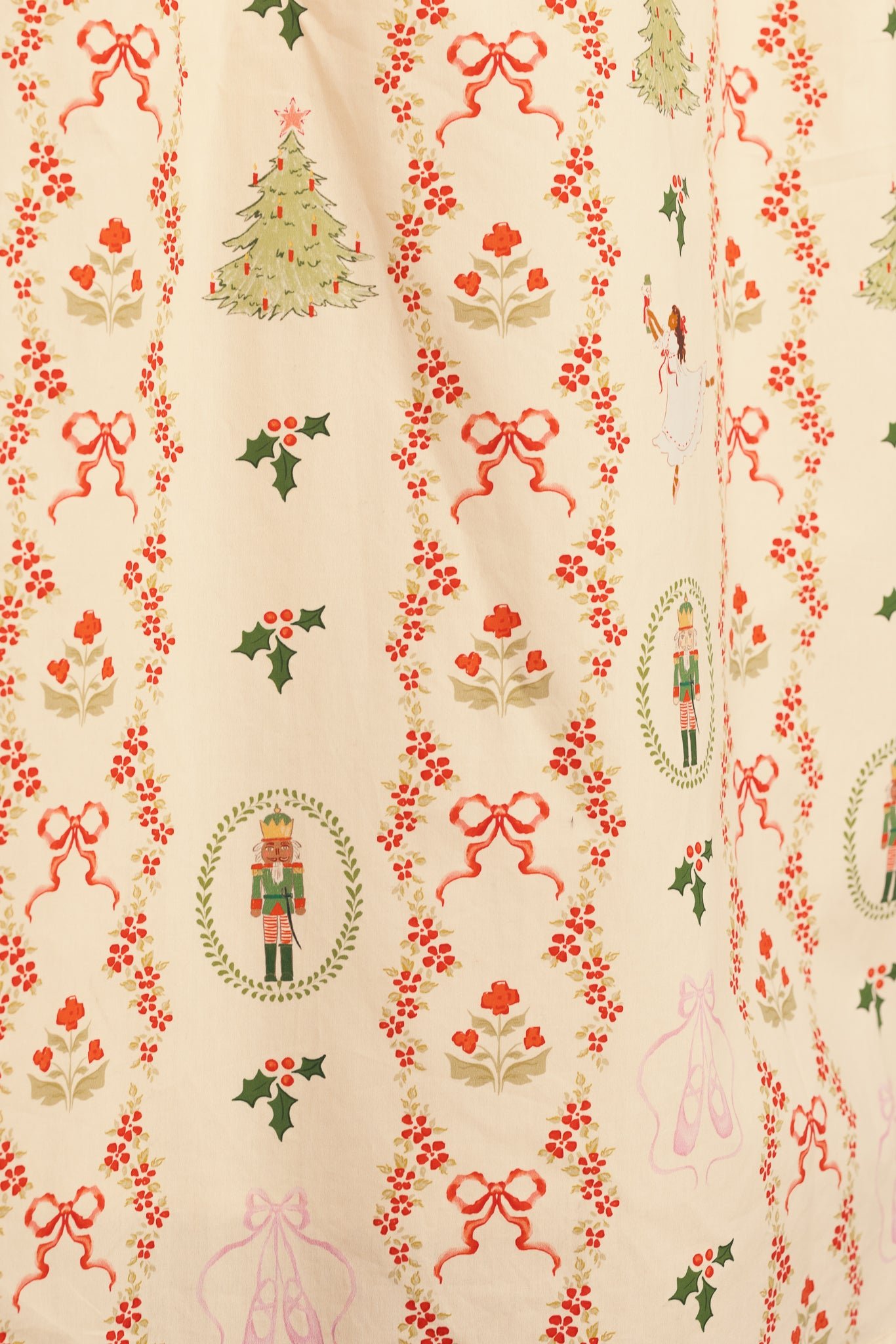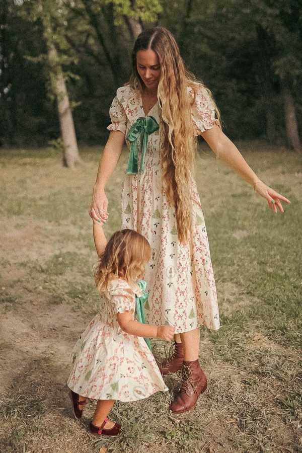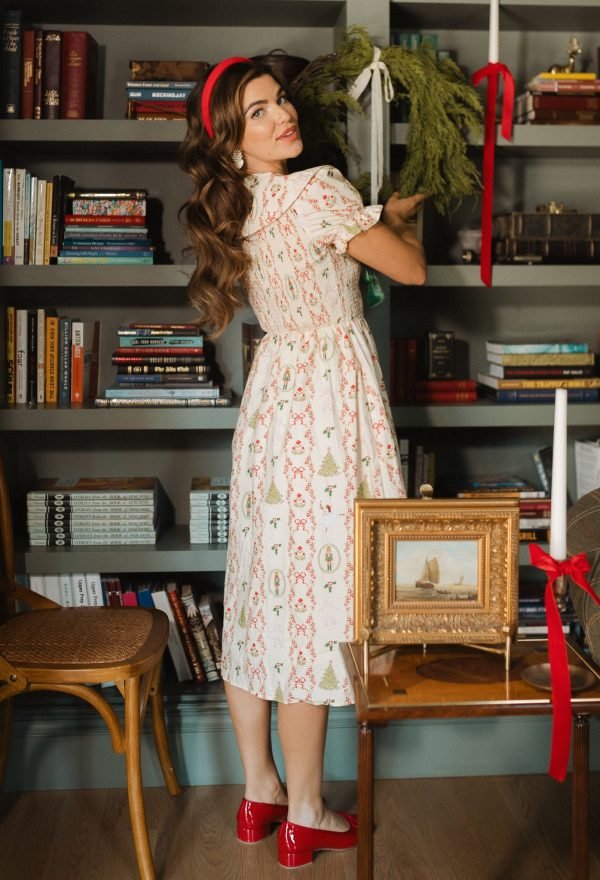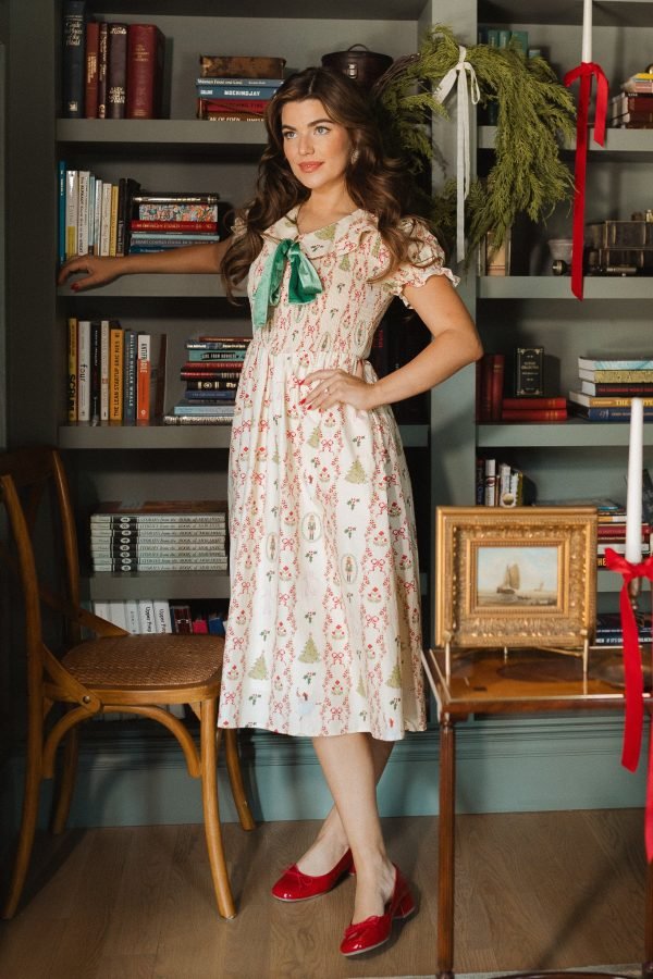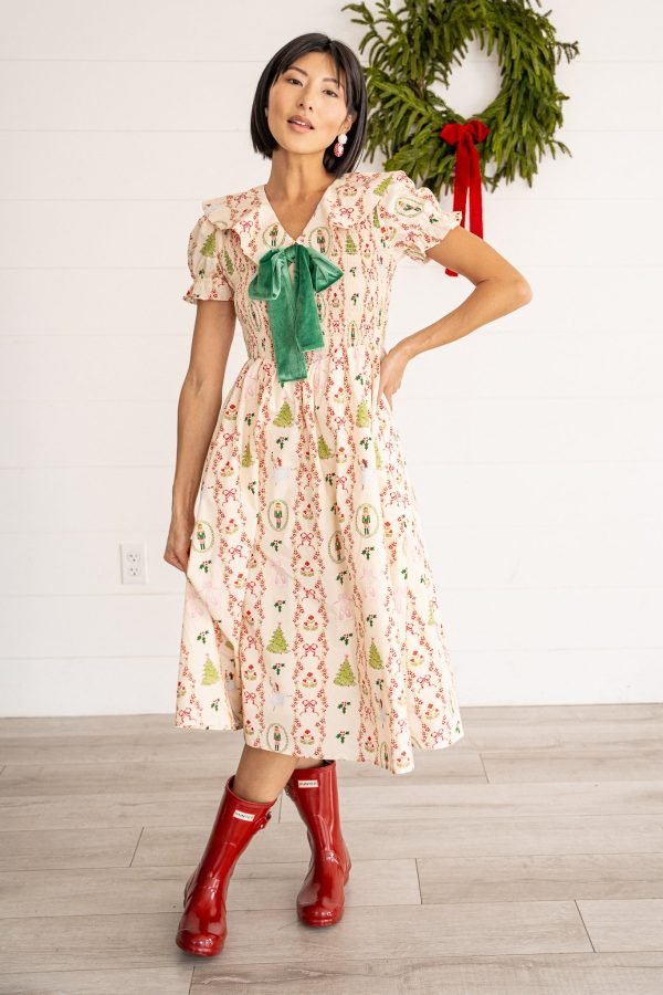 The dress that screams “happy holidays!” Introducing our festive collaboration with artist Celeste Clark! Featuring the most magical Nutcracker inspired print. with hand-drawn bows. Christmas trees. ballet slippers and more! Ruffle detailing. a beautiful velvet bow and smocking add delicate touches of femininity and class. She’s a beautiful holiday piece that you’ll wear for years and years!